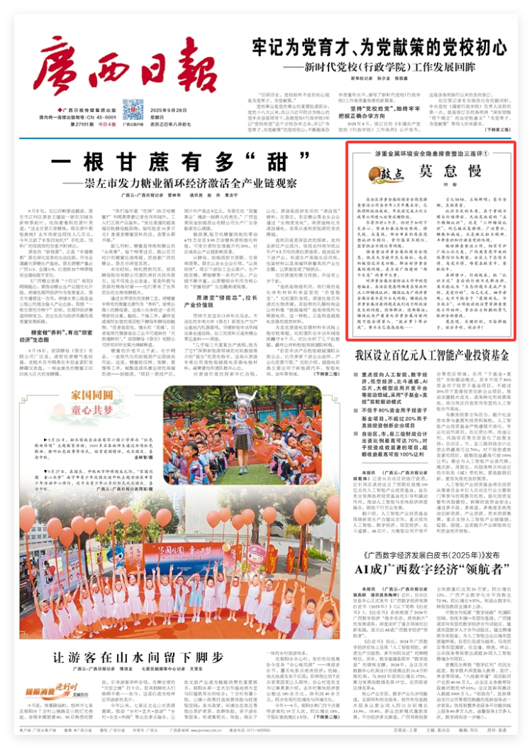 自治區(qū)涉重金屬環(huán)境安全隱患排查整治工作自今年3月開展至今,已取得階段性成效。年底前完成立行立改等工作進入攻堅關(guān)鍵階段。 盡管歷時6個月,但對于如何下定決心,堅決打贏這場攻堅戰(zhàn)、持久戰(zhàn)、反復戰(zhàn),部分市縣仍存在思想認識不到位、責任落實不到位、監(jiān)管執(zhí)法不到位等問題。 排查整治涉重金屬環(huán)境安全隱患,既是大力提升民生福祉,也是積極償還歷史舊賬。解決好涉重金屬環(huán)境問題,是當前廣西建好“兩個生態(tài)”的重中之重。 對涉重金屬污染防治工作中的思想偏差,自治區(qū)黨委明確要求堅決糾正三種錯誤認識:錯誤認為廣西涉重金屬污染不是什么大問題;錯誤認為涉重金屬污染問題是我們這個階段該發(fā)生的問題,很難解決、很難根治;錯誤認為嚴肅查處涉重金屬污染問題可能會得罪人、“拔出蘿卜帶出泥”,事不關(guān)己高高掛起…… 言之切切,立場鮮明;毫不含糊,直指要害。 認識不足的本質(zhì),在于重視不夠與行動滯后。無論是此前的“五個模糊認識”,還是“三種錯誤認識”,均已被反復強調(diào)、廣泛警示。懶散和拖延,正是缺乏擔當精神、斗爭意識和行動自覺的體現(xiàn)。 做好排查整治工作,切實守護廣西山水之美,廣西肩負黨中央的深厚信任與期望,全區(qū)上下怠慢不得、馬虎不得,唯有真抓實干、緊抓快干。 丟掉借口,行動起來,把“認識不足”身后的行動不足解決掉。再不能認為“生態(tài)問題不是我產(chǎn)生的,是前任的”,與己無關(guān)、袖手旁觀;也不可執(zhí)念于“愛惜羽毛、不當戰(zhàn)士”。必須把講政治貫穿排查整改工作始終,拿出壯士斷腕的勇氣抓好全面整改。 莫怠慢。關(guān)鍵時刻,不容掉鏈子。該出手時,快出手!