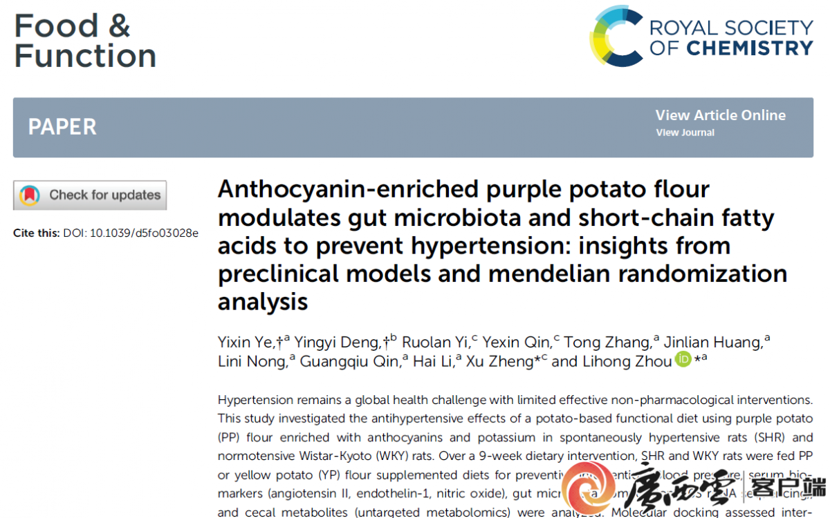 《Food & Function》發(fā)表的封面論文截圖。 日前,國(guó)際食品頂級(jí)期刊《Food & Function》發(fā)表封面論文,刊發(fā)廣西農(nóng)業(yè)科學(xué)院鄭虛研究員團(tuán)隊(duì)聯(lián)合廣西中醫(yī)藥大學(xué)和廣西大學(xué)研究團(tuán)隊(duì)的文章《富含花青素的紫色馬鈴薯米粉通過調(diào)節(jié)腸道菌群與短鏈脂肪酸預(yù)防高血壓:來自臨床前模型與孟德爾隨機(jī)化分析的證據(jù)》,首次系統(tǒng)揭示了紫色馬鈴薯米粉通過調(diào)控“腸道菌群—代謝物—血壓軸”,可預(yù)防高血壓,為馬鈴薯這一傳統(tǒng)主食賦予了新的健康內(nèi)涵。 科研團(tuán)隊(duì)成員在做相關(guān)實(shí)驗(yàn)。 資料顯示,目前全球有約14億人口面臨高血壓挑戰(zhàn),近年來,腸道菌群作為調(diào)控高血壓的新靶點(diǎn)備受關(guān)注,全食物干預(yù)策略因其天然、安全的特性展現(xiàn)出獨(dú)特優(yōu)勢(shì)。 馬鈴薯是世界公認(rèn)的全營(yíng)養(yǎng)食材,其不溶性膳食纖維、維生素A、維生素E、維生素C以及鉀、鋅、硒、鎂等元素的含量遠(yuǎn)高于大米,并且富含谷物中所缺乏的半胱氨酸和賴氨酸,是我國(guó)第四大糧食作物。 紫色馬鈴薯收獲現(xiàn)場(chǎng)。 課題組利用自主選育的富含花青素馬鈴薯新品種“桂彩薯1號(hào)”“桂農(nóng)薯1號(hào)”,開發(fā)了“馬鈴薯鮮薯直接加工馬鈴薯/大米復(fù)配米粉的方法”專利技術(shù),并以馬鈴薯米粉為原料開展了大鼠喂食紫色馬鈴薯米粉對(duì)血壓影響的研究。 研究結(jié)果表明,紫色馬鈴薯米粉通過調(diào)節(jié)大鼠的腸道菌群結(jié)構(gòu)、增加短鏈脂肪酸(SCFA)產(chǎn)生菌的豐度,改善了代謝通路,從而顯著降低了大鼠的收縮壓和舒張壓,防止了血壓升高。 此外,該研究通過推算人體食用等效劑量的干紫色馬鈴薯米粉(成人每日75克—150克),同樣達(dá)到降低血壓的效果,為紫色馬鈴薯米粉作為功能性食品在高血壓預(yù)防中的應(yīng)用提供了理論與實(shí)驗(yàn)依據(jù)。 用紫色馬鈴薯做成的干米粉。 該研究得到了廣西科技重大專項(xiàng)、國(guó)家公益性農(nóng)業(yè)行業(yè)科研專項(xiàng)等項(xiàng)目的資助。廣西中醫(yī)藥大學(xué)葉亦心博士與廣西大學(xué)鄧英毅博士為論文共同第一作者,通訊作者為廣西農(nóng)業(yè)科學(xué)院鄭虛研究員和廣西中醫(yī)藥大學(xué)周立紅副教授。團(tuán)隊(duì)成員易若蘭、覃葉欣、覃維治、劉國(guó)敏和廖玉嬌等參與了該項(xiàng)研究。 (文內(nèi)圖片均為科研團(tuán)隊(duì)提供) |