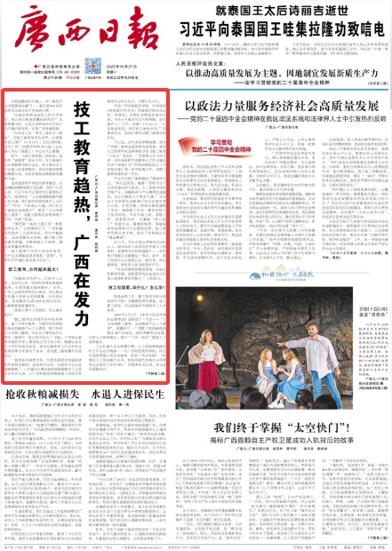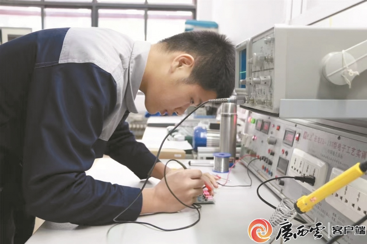 馮雪鋒在廣西二輕技師學(xué)院實(shí)訓(xùn)室測(cè)試電路板。(受訪者供圖) 如今,八桂大地的技工院校里,這樣的“破壁者”層出不窮:有人被海外企業(yè)高薪聘為技術(shù)尖兵,有人成為本土產(chǎn)業(yè)鏈上的首席技師,更有的像馮雪鋒般攜技從戎,用迷彩青春詮釋技能報(bào)國(guó)新內(nèi)涵。 這場(chǎng)重塑青年命運(yùn)的教育嬗變,亦是國(guó)家政策精準(zhǔn)落子的注腳。黨的十八大以來,習(xí)近平總書記多次作出重要指示批示,強(qiáng)調(diào)指出“工業(yè)強(qiáng)國(guó)都是技師技工的大國(guó),我們要有很強(qiáng)的技術(shù)工人隊(duì)伍”“作為一個(gè)制造業(yè)大國(guó),我們的人才基礎(chǔ)應(yīng)該是技工”,要求“大力發(fā)展技工教育”,為技工教育的發(fā)展指明了方向,開辟了航道。 “要把第一線的大國(guó)工匠一批批培養(yǎng)出來�!痹谡郀恳拢瑥V西構(gòu)建現(xiàn)代技術(shù)工人培養(yǎng)體系,深化產(chǎn)教融合,動(dòng)態(tài)調(diào)整專業(yè)結(jié)構(gòu),提升技工院校教學(xué)質(zhì)量,加快技能人才培養(yǎng),滿足高質(zhì)量發(fā)展需求。 技工教育正在發(fā)生深層次變革,為產(chǎn)業(yè)發(fā)展輸送更多技能“藍(lán)領(lǐng)”,為青年打開通往成功成才的大門。 技工教育,為何越來越火? “這批新生的學(xué)習(xí),已經(jīng)步入正軌。這5年以來,學(xué)校的報(bào)考熱度越來越高,生源質(zhì)量也越來越好�!苯眨瑥V西工業(yè)技師學(xué)院辦公樓里,院長(zhǎng)莫?jiǎng)?chuàng)才指著入學(xué)新生名冊(cè)感慨。今年招生季,該校提前完成3525名招生任務(wù),分?jǐn)?shù)線直逼普通高中。 一度被人看不上的技校,何以越來越火? “技工教育在職教體系中別具特色,屬于非學(xué)歷教育,主要定位和功能就是全面提高產(chǎn)業(yè)工人素質(zhì)。技工院校歸人社部門管理,畢業(yè)生主要奔赴用人單位一線崗位,就業(yè)導(dǎo)向突出�!睂�(duì)此,廣西職業(yè)教育發(fā)展研究中心常務(wù)副主任王屹介紹,隨著社會(huì)對(duì)人才評(píng)價(jià)標(biāo)準(zhǔn)的改變,家長(zhǎng)對(duì)教育投入產(chǎn)出和職業(yè)發(fā)展前景也更偏向于務(wù)實(shí),成為技工教育爆火的原因之一。 “雖然初中成績(jī)優(yōu)異,但我還是因?yàn)榧彝ソ?jīng)濟(jì)條件選擇進(jìn)技校。沒想到畢業(yè)后,也能在大企業(yè)里站穩(wěn)腳跟�!鄙掀ㄓ梦辶馔垦b車間高級(jí)技術(shù)工人藍(lán)世杰告訴記者,從廣西科技商貿(mào)高級(jí)技工學(xué)校汽車維修專業(yè)畢業(yè)至今,月薪已達(dá)萬元。 而在廣西商貿(mào)技師學(xué)院,汽車檢測(cè)(新能源汽車方向)預(yù)備技師班的李云智、陳勇安,憑借扎實(shí)技能和流利日語,今年6月通過豐田汽車招聘,前往海外工廠工作,初薪1.2萬元/月�!耙郧笆菦]得選,現(xiàn)在是主動(dòng)選未來。”陳勇安的話,投射出青年對(duì)技工教育的新認(rèn)知。 可以說,近年來的保障政策,成為廣西技工教育迅速發(fā)展的助推器。落實(shí)人力資源和社會(huì)保障部印發(fā)《技工教育“十四五”規(guī)劃》,廣西密集出臺(tái)《關(guān)于進(jìn)一步加強(qiáng)新時(shí)代高技能人才隊(duì)伍建設(shè)的若干措施》《廣西推動(dòng)技能強(qiáng)企工作實(shí)施方案》等一系列政策文件,為技工教育發(fā)展再添一把火。 產(chǎn)業(yè)則為技工教育提供了厚植的沃土�!拔覀儽O(jiān)測(cè)到,隨著廣西現(xiàn)代化產(chǎn)業(yè)體系建設(shè)深入推進(jìn),人工智能與傳統(tǒng)優(yōu)勢(shì)產(chǎn)業(yè)、戰(zhàn)略性新興產(chǎn)業(yè)集群加速融合,企業(yè)對(duì)技能人才需求大增�!弊灾螀^(qū)人力資源社會(huì)保障廳相關(guān)處室負(fù)責(zé)人介紹,目前的技工院校設(shè)置普通技工學(xué)校、高級(jí)技工學(xué)校、技師學(xué)院三個(gè)層次院校,開設(shè)中級(jí)工班、高級(jí)工班、預(yù)備技師班,與國(guó)家“新八級(jí)工”制度對(duì)應(yīng)。隨著新能源、高端裝備制造等新興產(chǎn)業(yè)蓬勃發(fā)展,技工教育憑借自身優(yōu)勢(shì),成為了優(yōu)質(zhì)就業(yè)的“黃金賽道”。 近三年,畢業(yè)生就業(yè)率穩(wěn)定在95%以上,超60%進(jìn)入實(shí)體經(jīng)濟(jì)和重大工程項(xiàng)目,起薪較5年前普遍提升……各項(xiàng)統(tǒng)計(jì)數(shù)據(jù)也支撐著這一觀點(diǎn)。此外,技工院校畢業(yè)生技能扎實(shí)、能吃苦、職業(yè)素養(yǎng)高,得到用人單位較高的評(píng)價(jià)。 “從在校教育到繼續(xù)深造、從就業(yè)到薪資待遇,技能藍(lán)領(lǐng)的社會(huì)地位與價(jià)值正被重新審視和提升�!蓖跻俦硎�。 技工校園里,學(xué)什么?怎么學(xué)? 同是培養(yǎng)工匠,技工院校與職業(yè)院校有何不同?其最明顯特征便是,進(jìn)入技工院校,學(xué)生就被當(dāng)作準(zhǔn)技術(shù)工人來培養(yǎng)。 2022年5月1日,《中華人民共和國(guó)職業(yè)教育法》里新添了一句話——“大力發(fā)展技工教育,全面提高產(chǎn)業(yè)工人素質(zhì)”。緊跟時(shí)代,廣西技工院校敏銳捕捉區(qū)域產(chǎn)業(yè)動(dòng)態(tài),及時(shí)調(diào)整專業(yè)設(shè)置,創(chuàng)新人才培養(yǎng)模式,推行“工學(xué)一體化”技能人才培養(yǎng)模式。 工業(yè)