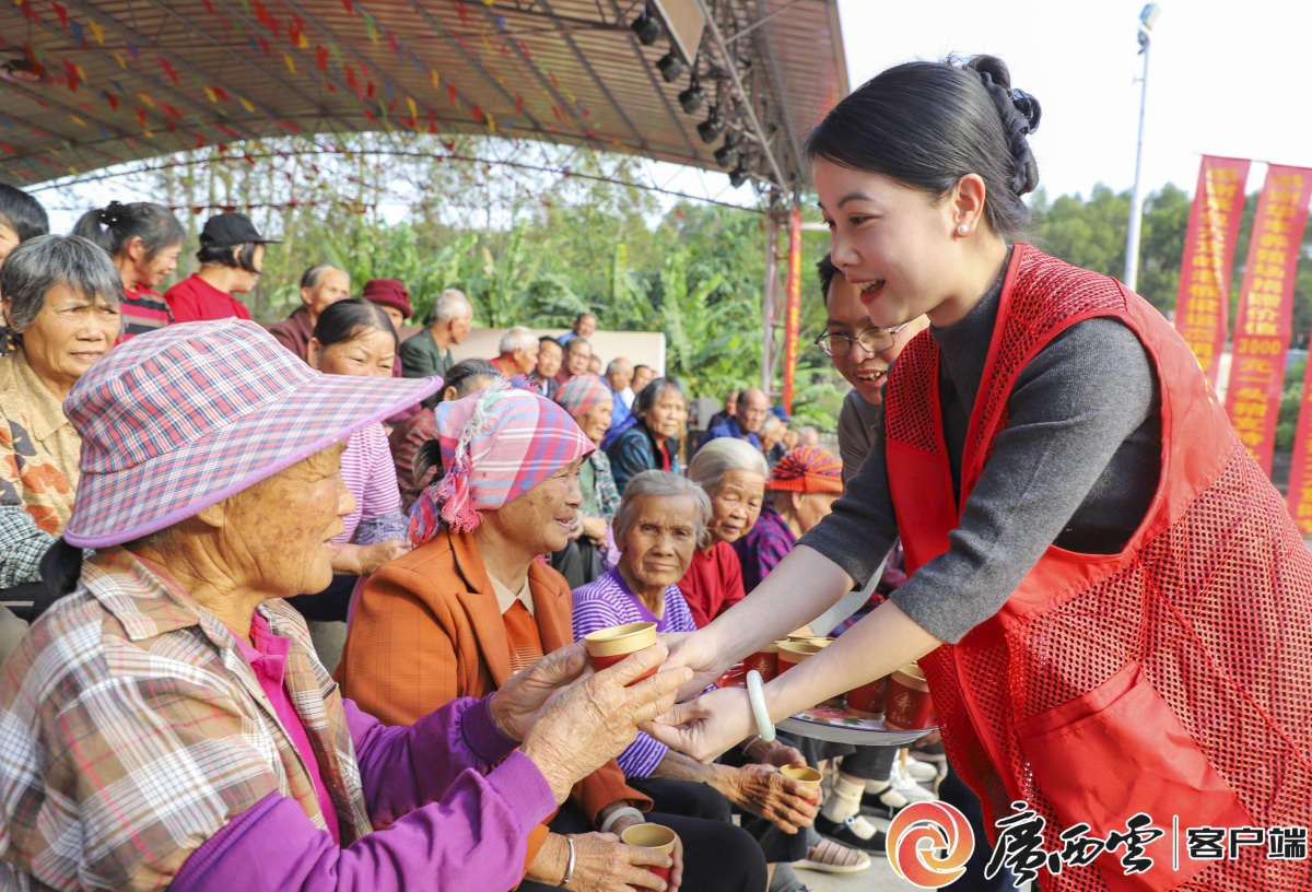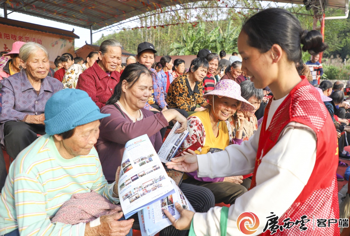 志愿者向老人開(kāi)展宣傳。 木堂村是民風(fēng)淳樸的壯族聚居村落,素有團(tuán)結(jié)鄰里、孝老敬親的優(yōu)良傳統(tǒng)。當(dāng)日,木堂村廣場(chǎng)上,百余桌長(zhǎng)壽宴整齊鋪開(kāi),米酒、糍粑、扣肉等特色美食香氣彌漫,老人與晚輩圍坐共餐,笑談家常。舞臺(tái)上,村民自編自演的原生態(tài)壯歌輪番唱響,歌聲中滿是對(duì)長(zhǎng)輩的祝福;村委會(huì)前,志愿者為老人送上裝滿生活用品的慰問(wèn)包和暖心紅包,受表彰的“孝親榜樣”“公益模范”身披紅綢,成為現(xiàn)場(chǎng)最亮眼的“明星”。夜幕降臨,彩調(diào)、舞蹈、小品輪番登場(chǎng),掌聲與笑聲交織,壯族風(fēng)情與傳統(tǒng)孝道在歡聲笑語(yǔ)中交融。此外,活動(dòng)還設(shè)立政策宣傳、健康義診、防詐騙咨詢(xún)等志愿服務(wù)臺(tái),發(fā)放民族團(tuán)結(jié)、移風(fēng)易俗等宣傳資料,將惠民政策與民族團(tuán)結(jié)理念送到村民身邊。
