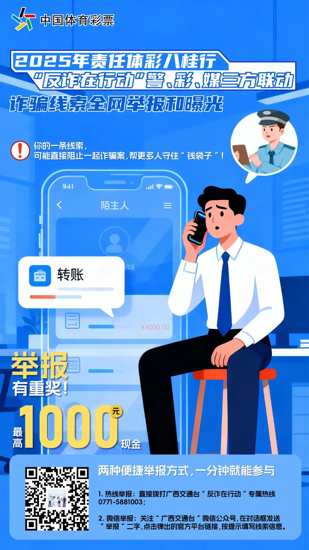 為什么要加入“反詐在行動”? 當(dāng)前網(wǎng)絡(luò)詐騙手段隱蔽、翻新快,單靠單一力量難以全面打擊。此次2025年責(zé)任體彩八桂行“反詐在行動”由廣西體彩中心、廣西反詐中心、廣西交通臺三方強(qiáng)強(qiáng)聯(lián)合發(fā)起,就是要搭建一個“全民參與、線索直通、快速攔截”的平臺——你的一條線索,可能直接阻止一起詐騙案,幫更多人守住“錢袋子”! 舉報有重獎!最高1000元現(xiàn)金等你領(lǐng) 為鼓勵全網(wǎng)積極提供線索,本次“反詐在行動”推出重磅獎勵機(jī)制:只要你提供的私彩詐騙線索,經(jīng)公安機(jī)關(guān)成功破案,就能獲得現(xiàn)金獎勵,最高可達(dá)1000元! 無論線索大小,只要真實有效,都有機(jī)會獲獎。這不僅是對反詐參與者的認(rèn)可,更是對每一份“守護(hù)力量”的回饋! 兩種便捷舉報方式 一分鐘就能參與 擔(dān)心舉報麻煩?別擔(dān)心!我們開通了兩條簡單易操作的線索提交渠道,隨時隨地都能參與: 1.熱線舉報 直接撥打廣西交通臺“反詐在行動”專屬熱線0771-5881003,向工作人員清晰說明你發(fā)現(xiàn)的私彩詐騙線索(如詐騙話術(shù)、涉事賬號、交易方式等)。 2.微信舉報 關(guān)注“廣西交通臺”微信公眾號,在對話框發(fā)送“舉報”二字,點擊彈出的官方平臺鏈接,按提示填寫線索信息即可。 提交后,廣西刑偵總隊網(wǎng)絡(luò)新型犯罪偵查支隊會第一時間研判線索,一旦確認(rèn)并成功攔截/破案,獎勵會盡快兌現(xiàn)! 全網(wǎng)行動起來!讓詐騙無處遁形 “反詐在行動”不是某一方的事,而是需要每一個人的加入: 如果你是彩民:發(fā)現(xiàn)“高賠率私彩”“內(nèi)部透號”等可疑信息,及時舉報。 如果你是上班族:看到同事、朋友被網(wǎng)絡(luò)詐騙誘導(dǎo),提醒TA并協(xié)助舉報。 如果你是學(xué)生:在社交平臺刷到刷單推廣,留存證據(jù)后提交線索。 每一次舉報,都是在為反詐防線添磚加瓦;每一份參與,都能讓詐騙分子無處可藏! “反詐在行動” 正式啟動全網(wǎng)征集詐騙線索! 舉報有獎、守護(hù)有你! 讓我們一起行動 用線索擊碎詐騙套路 攜手共建無詐環(huán)境!
