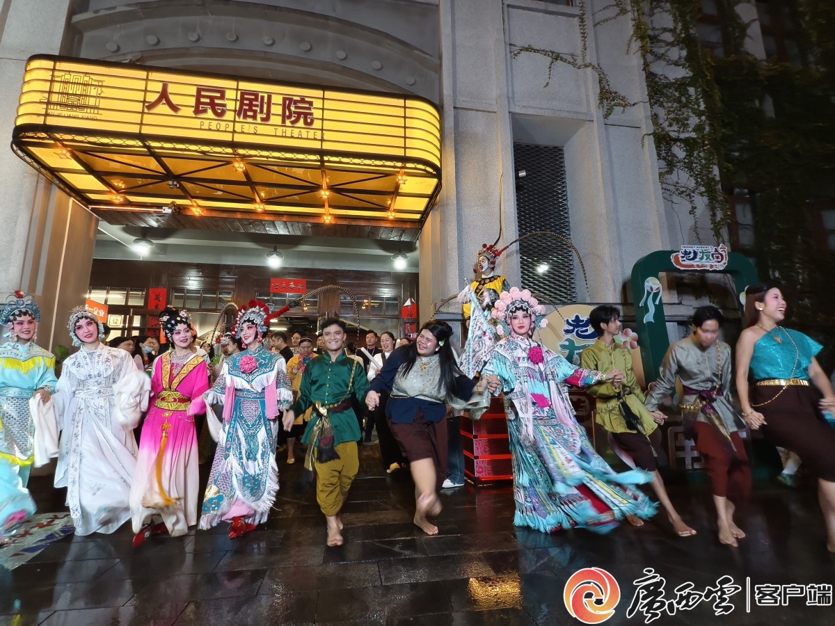 戲劇周落幕后的演員大聯(lián)歡現(xiàn)場。記者 徐天保 攝 帷幕落下處,情誼正生長。當最后一縷戲腔消散于暮色,三街兩巷人民劇院門前卻升騰起另一重?zé)狒[光景。中國與印尼、菲律賓、越南、緬甸等東盟國家的演職人員攜手,在斑駁的老城墻下即興起舞,歡歌笑語漫過青磚灰瓦,見證著文明互鑒的新章。 |