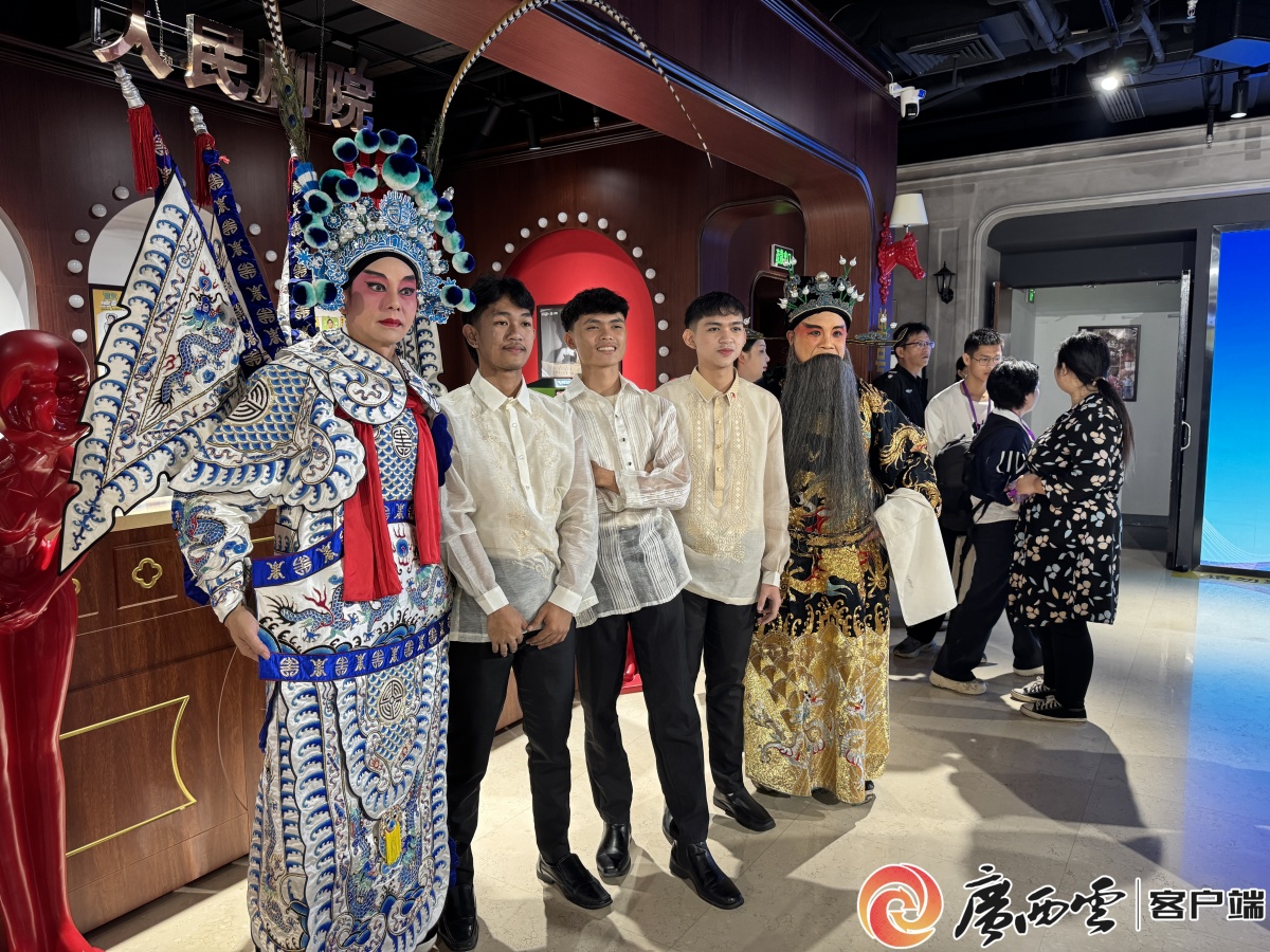 11月1日晚,南寧夜雨微涼,三街兩巷人民劇院里卻暖意融融。 暖黃色燈光下,購票大廳人頭攢動,參加今晚戲劇周大聯(lián)歡活動的中國與東盟國家演員盛裝亮相,與前來觀賞演出的觀眾們熱情合影互動。 菲律賓布拉干省官方劇團演員小伙GABRIEL J.ANDES在一旁觀望了許久,終于鼓起勇氣走向前,與裝扮華麗的邕劇演員合影,單人照拍完,又與劇團成員一起拍集體照,邕劇演員傳統(tǒng)戲曲服裝與菲律賓現(xiàn)代歌舞服形成鮮明對比。 菲律賓布拉干省官方劇團演員與邕劇演員合影。記者 沈程 攝 “明天就要回菲律賓了,這幾天在中國演出的日子很難忘,回去之后希望能留些念想,下次還能再來表演�!盙ABRIEL J.ANDES剛年滿18歲,此次是第一次來戲劇周演出,邕劇妝容、頭飾、服裝等中國傳統(tǒng)戲曲文化讓他印象深刻,心中已然種下了一顆文化交流的種子。 今年是中國—東盟文化交流年,作為中國—東盟(南寧)文化月重要活動之一,第十二屆中國—東盟(南寧)戲劇周備受中外藝術(shù)院團青睞。僅一周時間,南寧貴賓紛至、戲劇不斷,柬埔寨、印度尼西亞、馬來西亞、緬甸、泰國、越南、新加坡、菲律賓等8個東盟國家的11個藝術(shù)團體,以及中國11個省(市)的29個文藝院團接連上演了25場精彩演出,令全城市民游客大飽眼福。