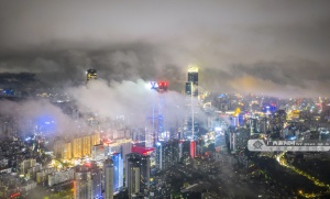 11月3日晚,雨后南寧東盟商務(wù)區(qū)上空云霧繚繞,如輕紗漫舞般纏繞著林立樓宇。城市霓虹與萬家燈火穿透薄霧,暈染出層層暖光,流光與云霧交織纏繞,勾勒出南寧夜雨后獨有的詩意與浪漫,引得市民紛紛駐足定格這份 “仙境限定” 美景。何光民 攝(廣西云-廣西日報)