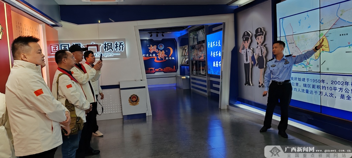 采訪團(tuán)在東興邊境派出所了解有關(guān)情況。記者 樊成甫 攝 廣西新聞網(wǎng)東興11月6日訊(記者 樊成甫 陽(yáng)繼樂(lè) 通訊員 譚蘇侶 胡明榮)北侖河畔,界碑聳立。在廣西東興口岸,一個(gè)集多部門(mén)力量于一體的國(guó)門(mén)警務(wù)站,正讓新時(shí)代“楓橋經(jīng)驗(yàn)”在這片邊境地區(qū)煥發(fā)勃勃生機(jī)。