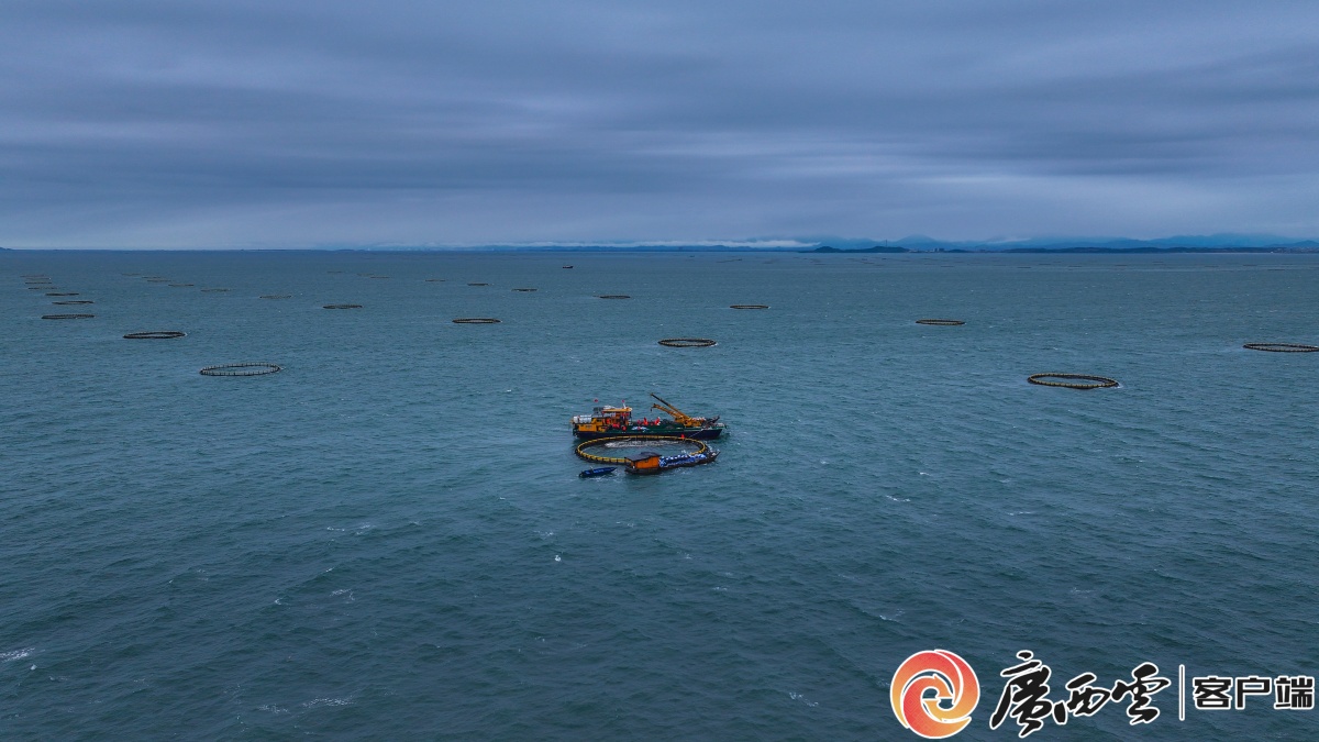 海洋牧場上星羅密布的“甜甜圈”。 11月5日,清晨七點,記者跟隨防城港金色海洋產(chǎn)業(yè)發(fā)展有限公司的捕魚船只,迎著深秋的海風一同前往廣西首個國家級海洋牧場——位于防城港市防城區(qū)的白龍珍珠灣海洋牧場示范區(qū)。防城港金色海洋產(chǎn)業(yè)發(fā)展有限公司負責人李楠介紹:“現(xiàn)在我們前往距離雙墩碼頭數(shù)海里外的海洋牧場,進行金鯧魚捕撈,今天預計捕撈12萬斤�!睆目罩懈╊渲闉成詈=瘀K魚養(yǎng)殖基地,數(shù)百口深�!疤鹛鹑Α狈植荚谖邓{的海面上,場面震撼。經(jīng)過近一小時的海上航行,我們來到了該公司養(yǎng)殖基地,現(xiàn)場已是一片繁忙景象。工人正緊張進行捕撈準備作業(yè),只見工人們把網(wǎng)箱逐漸收緊,藏于深海網(wǎng)箱內的金鯧魚成片浮出水面,金鯧魚甩著圓潤的身子碰撞碧波,濺起連片水花,熱鬧得像場水上盛會。隨后,工人們操作捕魚船上的起重機拉起網(wǎng)兜,將一兜兜肥美的金鯧魚從深水養(yǎng)殖網(wǎng)箱轉移運送到捕撈船的冰鮮保溫船艙內。