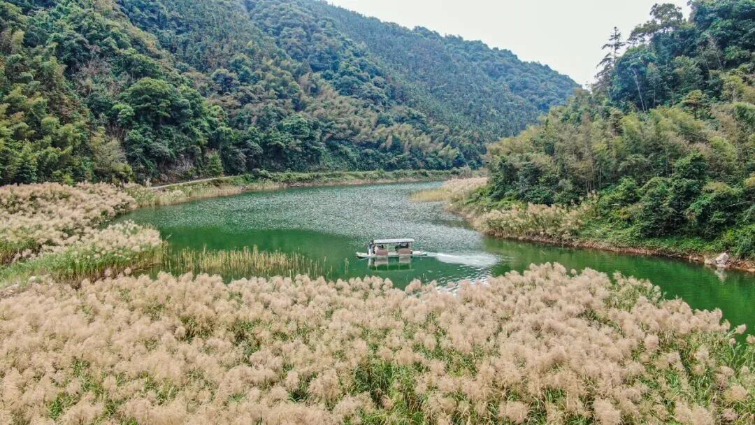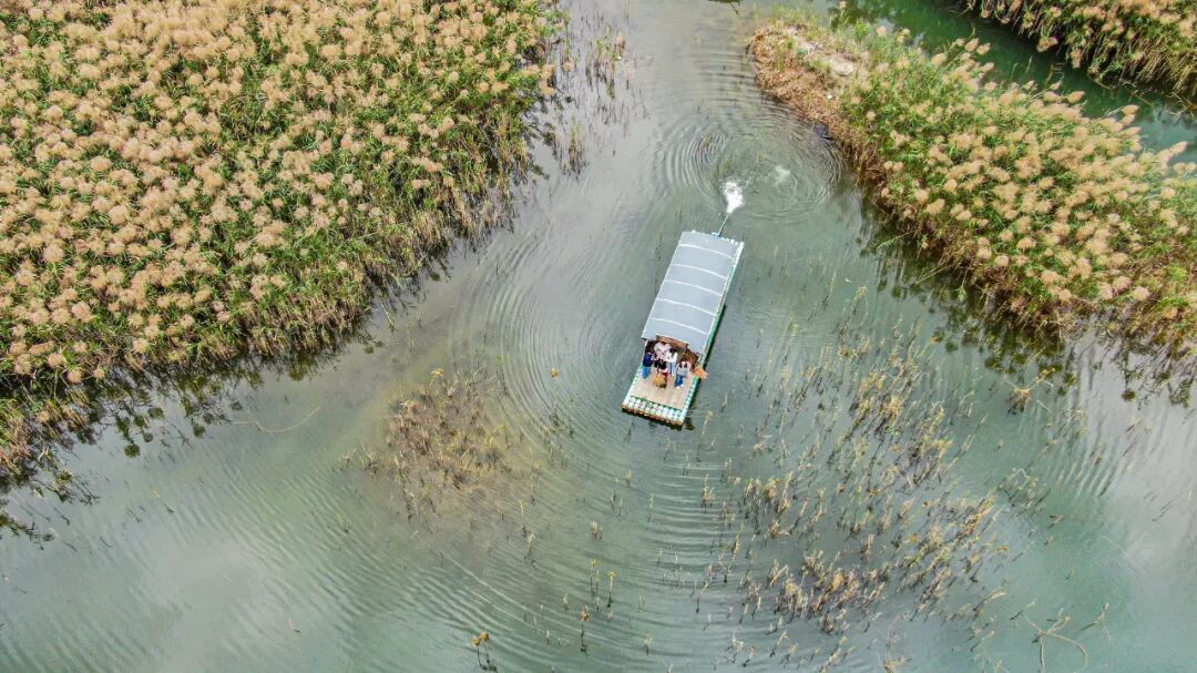 從空中俯瞰,盛放的蘆花如波如浪,為大地鋪上了一層夢幻的白色地毯,層層疊疊的蘆葦連綿成片,蜿蜒的鄉(xiāng)村小路和清澈的河流穿梭其間,與連綿的青山共同構成了一幅層次豐富的生態(tài)畫卷。近看,一簇簇潔白的蘆花在陽光下泛著柔和的光澤,隨風輕盈舞動,沙沙作響。湖面上,游船悠然劃破平靜的水面,三兩游客悠閑乘船,從另一種視角欣賞這片蘆花勝景。兩岸的葦浪如白色帷幕緩緩移過,舟行景移,帶來“船在江上走,人在畫中游”的獨特體驗。