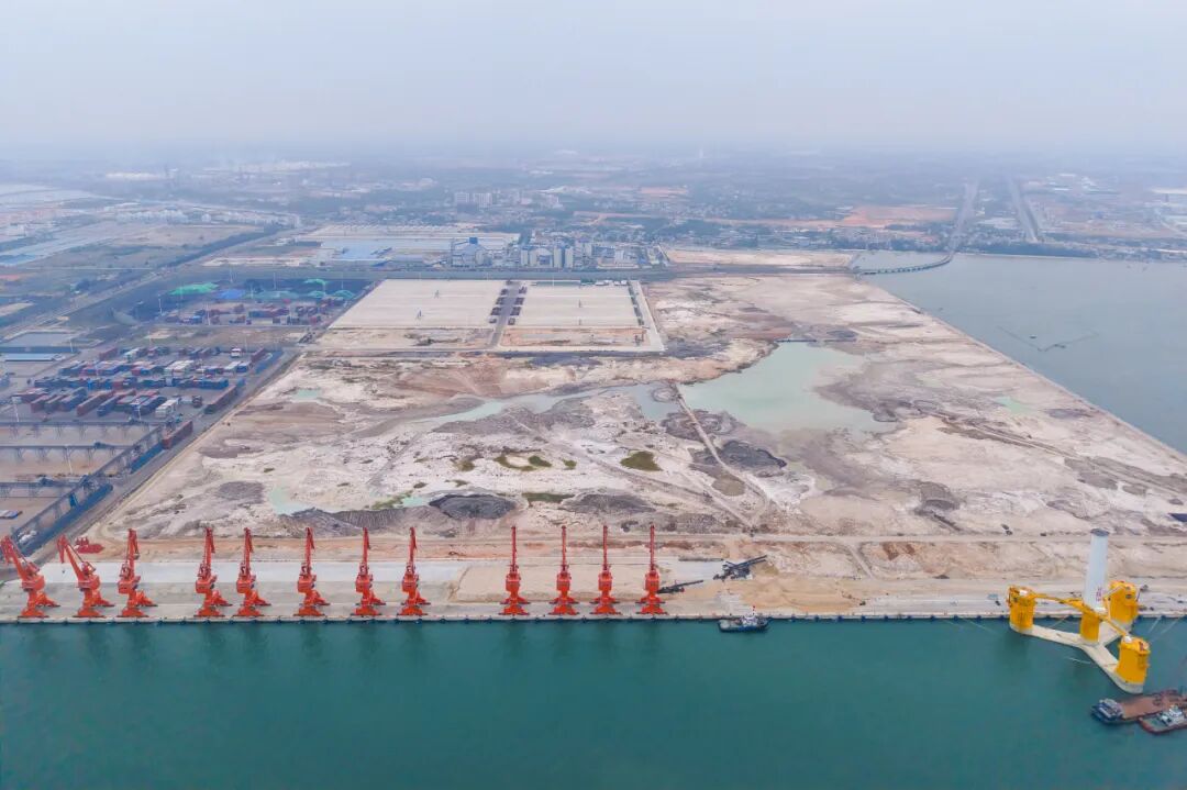 鐵山港7號(hào)、8號(hào)泊位工程航拍圖。北海碼頭供圖 作為自治區(qū)“十四五”重點(diǎn)項(xiàng)目,該工程由北部灣港集團(tuán)于2021年4月開工,設(shè)計(jì)年通過能力770萬噸,岸線總長599米。當(dāng)天,自治區(qū)及北海市相關(guān)部門組成的驗(yàn)收核查組,通過聽取報(bào)告、實(shí)地核查、查閱資料及集中討論后,確認(rèn)項(xiàng)目符合設(shè)計(jì)及規(guī)范要求,設(shè)備配置到位、資料齊全,同意通過驗(yàn)收。 此次驗(yàn)收的一期工程,涵蓋碼頭水工、疏浚、導(dǎo)助航設(shè)施及12臺(tái)門座式起重機(jī)、后方陸域等內(nèi)容。項(xiàng)目新增約30萬平方米道路堆場,可滿足每年200萬噸貨物堆存及中轉(zhuǎn)需求,暢通大宗貨物物流通道。建設(shè)過程中,建設(shè)單位克服地基復(fù)雜、氣象影響、工期緊張等難題,確保工程安全優(yōu)質(zhì)高效完工,完善了北海港區(qū)功能布局。