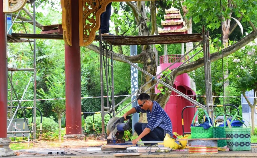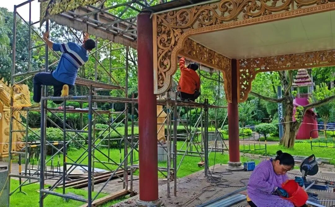 此次翻新既是技術(shù)層面的優(yōu)化升級,更是文化傳承的生動實(shí)踐。工程團(tuán)隊采用低成本、高耐久的技術(shù)方案,在守護(hù)緬甸原汁原味建筑藝術(shù)風(fēng)貌的同時,踐行綠色園林的維護(hù)理念。修繕后的涼亭重現(xiàn)初建時的璀璨風(fēng)采:陽光下,鈦金花邊折射出傳統(tǒng)工藝的精湛細(xì)節(jié),與園內(nèi)金光璀璨的幸福門相映成趣,盡顯濃郁的東南亞風(fēng)情。