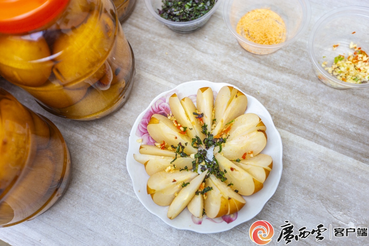 村民徐英在展示鹽浸沙梨食用方法。見習記者 韋雨函 攝 “鹽浸沙梨可即食、拌炒、蘸椒鹽,也可搭配紫蘇、辣椒、蒜蓉食用,百味隨心�!彼錾吓淞现�,梨片入口,酸甜汁液瞬間在舌尖綻放,脆爽的質(zhì)地在唇齒間跳躍,余韻還殘留著一縷鹽香。 “雙鳳村是沙梨種植發(fā)源地,清代(公元1820年)便有記載,至今200余年�!贝妩h支部書記李樹坤介紹,全村種植規(guī)模超3000畝,幾乎家家種梨�!懊磕觊_春,遠行的親人總要帶上幾罐浸沙梨�!泵恳豢美鏄�,都見證過游子離鄉(xiāng)時的不舍;每一罐浸沙梨,都封存著母親無聲的牽掛。