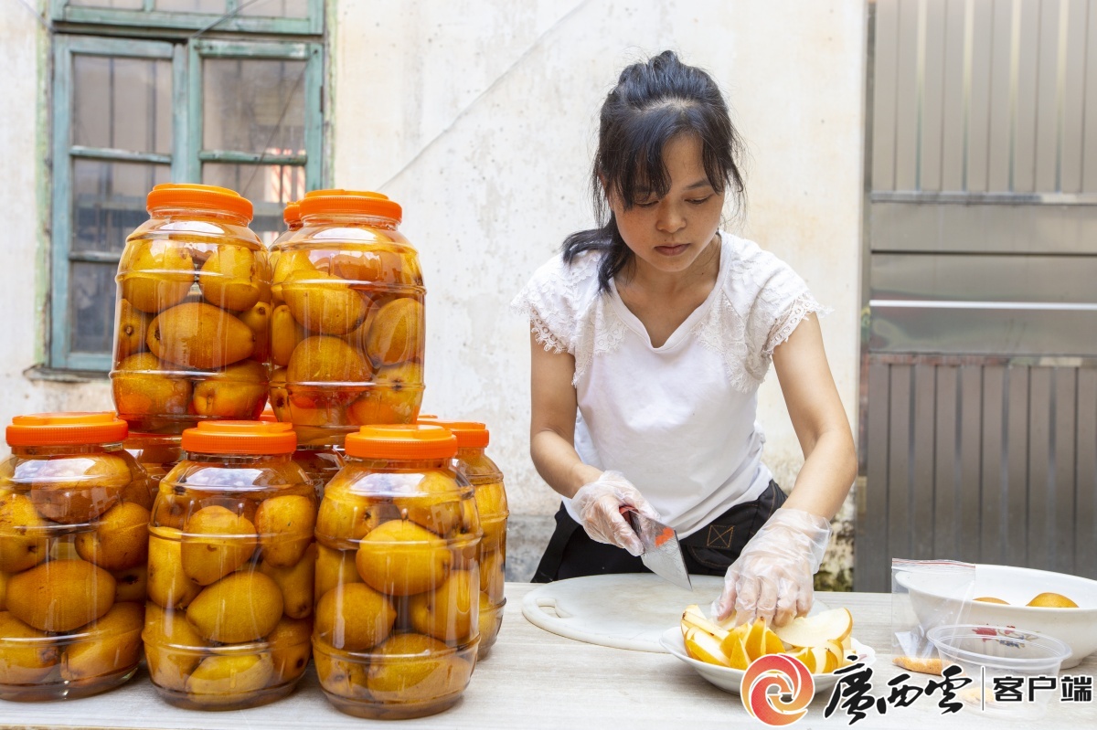 一罐罐鹽浸沙梨擺放整齊。見習記者 韋雨函 攝 談及品種改良,李樹坤感念不已:“村里曾有位叫‘八爺’的老者,一生專注于梨樹改良。經(jīng)多年觀察和試驗,終于在嫁接技術(shù)上取得突破,大大提升了梨的品質(zhì)與產(chǎn)量�!币虼�,新品種被村民親切地稱為“八爺梨”。2021年,村中“梨王”樹產(chǎn)果250公斤,鮮果價值達2000元,制成浸沙梨后更躍至5000元。 76歲的李旺坤是雙鳳村種梨資歷最老者�!安坏�10歲隨爺爺打理梨樹,如今仍守著七八畝梨地,最老的樹已逾百年�!彼H歷了浸沙梨從挑擔叫賣到客商上門、從大缸散裝到精致罐裝的變遷。“如今我在家里開設(shè)電商快遞服務(wù)站,村民不出村就能發(fā)貨�!崩顦淅ぱa充道。 說到電商,“李大小姐酸嘢店”在村里小有名氣。我們到訪時,弟弟李鈺澤正麻利地洗梨裝罐,姐姐李文娟在錄制視頻。 “母親嫁來雙鳳后便開始做浸沙梨,一做就是30年�!泵ν晔诸^工作,姐弟倆聊起家業(yè)�!捌鸪踔淮挣r果,我們七八歲就開始幫忙。后來母親見散賣不便,率先嘗試罐裝密封,沒想到一下子就賣火了,全村紛紛效仿。”兩人的回憶里滿是梨香。