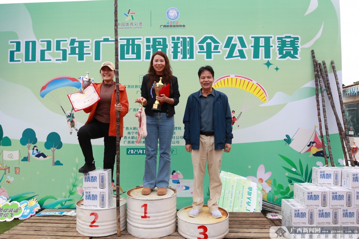 11月6日,2025年廣西滑翔傘公開賽在廣西大明山滑翔傘基地順利收官。本屆賽事在經(jīng)典的個人與團(tuán)隊定點賽之外,創(chuàng)新增設(shè)了“地面斗傘”項目,為來自全國各地的頂尖選手帶來了全新的挑戰(zhàn),也為觀眾呈現(xiàn)了一場“精準(zhǔn)降落”與“地面斗傘”相結(jié)合的綜合性競技盛宴。 現(xiàn)場舉行頒獎儀式。 被譽為“中國天然氧吧”的廣西大明山,在比賽期間為選手提供了絕佳的競技舞臺。依托優(yōu)越的自然環(huán)境,本次比賽設(shè)置男、女個人定點賽及團(tuán)隊賽,全面考驗運動員的飛行操控技術(shù)與心理素質(zhì)。比賽過程中,運動員們憑借精湛技藝駕馭傘翼,于藍(lán)天白云間穿梭,展現(xiàn)出滑翔傘運動獨特魅力,更詮釋了競技體育的拼搏精神。