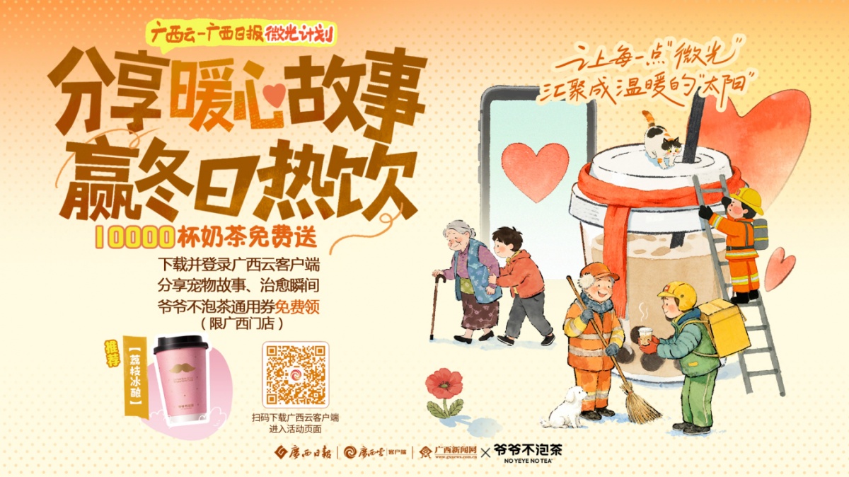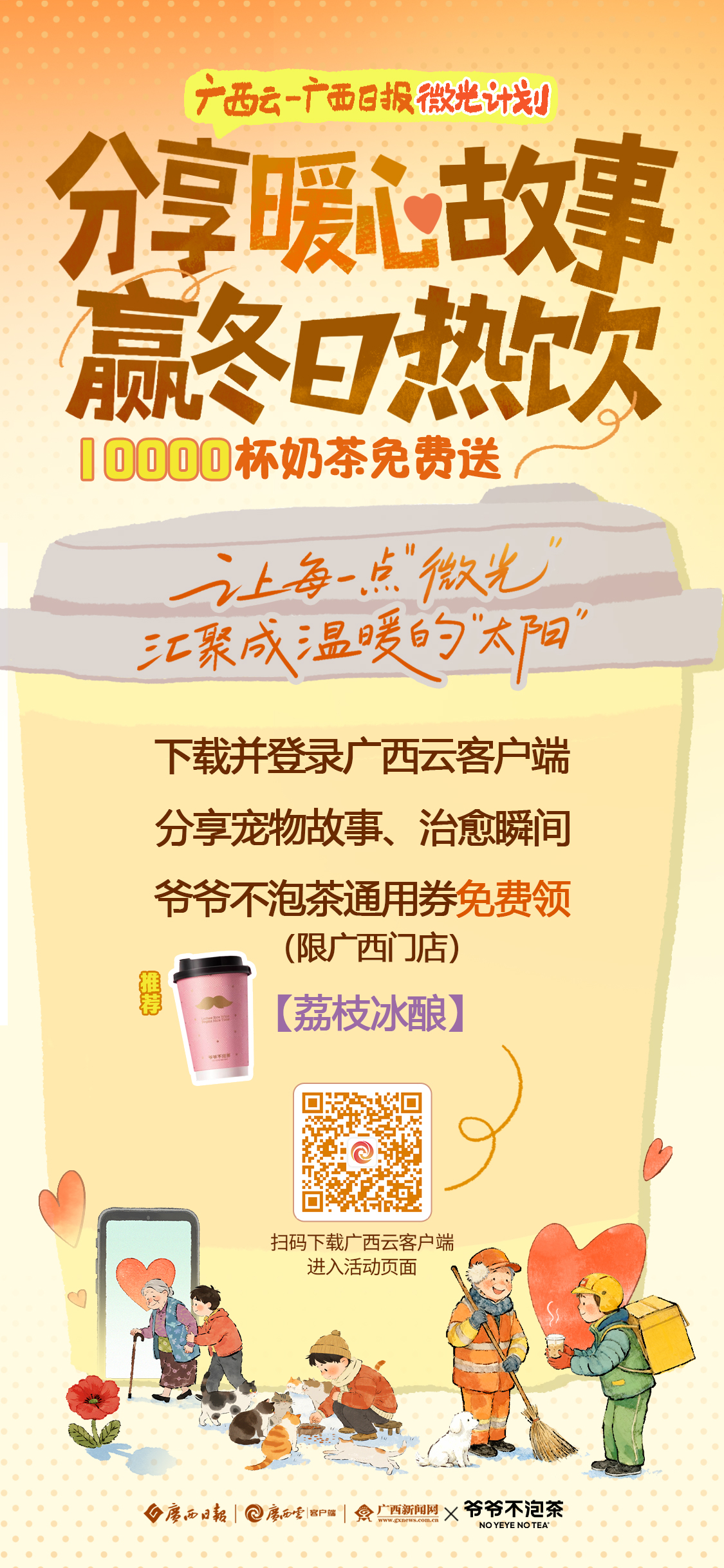 冬日冷風(fēng)習(xí)習(xí) 愿每一個生命都能被溫柔以待 冬日「微光計劃」第二期話題 “有哪一個瞬間,你曾被它們治愈?” 分享你經(jīng)歷過或聽過看過的暖心故事 我們就免費送奶茶和貓咪周邊! 本期福利 爺爺不泡茶廣西通用奶茶券 主推非遺經(jīng)典款:荔枝冰釀 當(dāng)非遺孝感米釀,遇上淡雅花魁單叢 再融入清甜荔枝汁、香醇牛奶與溫柔桂花凍 一口下去,荔枝的鮮、米釀的醇、茶底的甘爽 層層交織,化作冬日里一抹溫柔的清甜 讓這杯清甜軟的荔枝冰釀 成為點亮冬日的暖心微光 領(lǐng)取方式 下載廣西云客戶端 搜索“微光計劃”進入專題頁 分享被寵物治愈的瞬間或身邊的暖心故事 提交審核通過后 即可獲得 爺爺不泡茶奶茶券哦 全場通用(限廣西門店) 本期2500杯,先到先得! (點擊海報進入活動頁面↓↓↓) 除了分享暖心故事領(lǐng)奶茶 本期在活動頁留言區(qū)點贊前10的暖心故事 還能獲得—— 爺爺不泡茶桃桃喵手機背夾