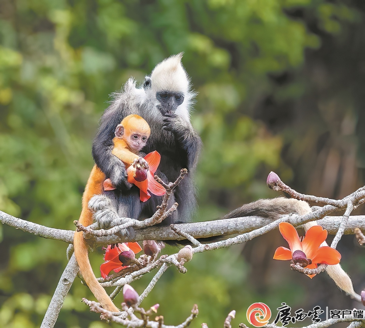 在崇左白頭葉猴國家級自然保護區(qū),白頭葉猴母子在采食花蜜。吳兆榮 攝 來源:廣西云-廣西日報