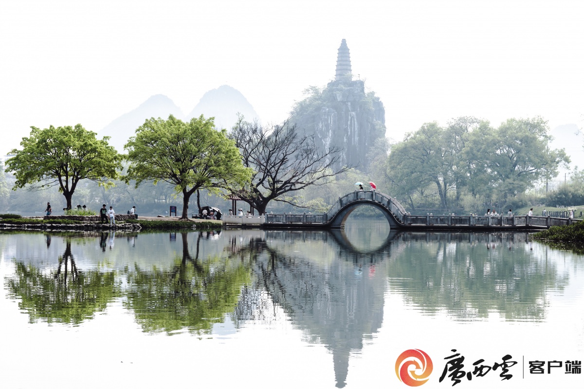 在桂林塔山公園,水面和塔山形成鏡面,極富詩意。黃智權 攝 來源:廣西云-廣西日報