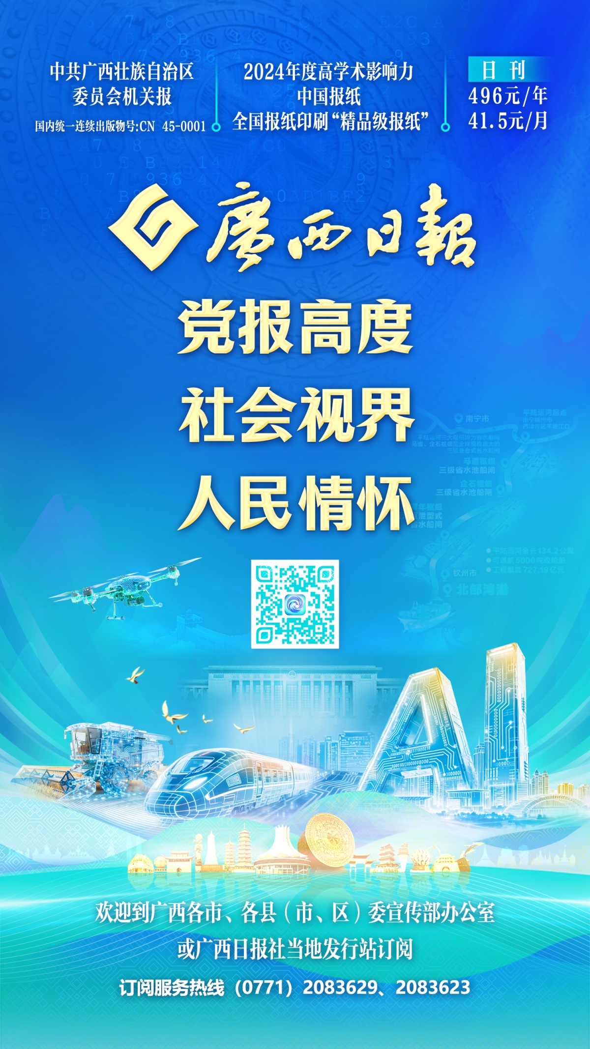 一份初心,雙向賦能 《廣西日報》 是中共廣西壯族自治區(qū)委員會機(jī)關(guān)報 創(chuàng)刊于1949年12月3日 始終牢記初心使命 堅(jiān)持政治家辦報 持續(xù)推動黨的創(chuàng)新理論在八桂大地 走深走實(shí)、入腦入心 為凝心聚力講好中國故事 傳遞廣西聲音發(fā)揮重要作用 訂閱價格 496元/年,41.5元/月 訂閱方式 歡迎到廣西各市、各縣(市、區(qū))委宣傳部辦公室或廣西日報社當(dāng)?shù)匕l(fā)行站訂閱 訂閱服務(wù)熱線 (0771)2083629、2083623 時代在變,需求在變 《廣西日報》的陪伴 不止于紙間的沉浸 更在于指尖的暢達(dá) 2026年1月1日 全新的廣西云客戶端2026版將正式上線 這是集新聞資訊、政務(wù)服務(wù)、 智慧生活、互動社交為一體的綜合平臺 聚合全國權(quán)威媒體及 廣西區(qū)市縣三級媒體海量新聞數(shù)據(jù) 為每一位用戶提供更多 有價值、有溫度、有特色的信息服務(wù) 點(diǎn)擊圖片或掃碼即可下載廣西云客戶端。 深耕內(nèi)容,品質(zhì)為核 筆下有溫度,紙上有深度 這些欄目,你是否也在追更? 廣西日報社堅(jiān)持主力軍全面挺進(jìn)主戰(zhàn)場,持續(xù)推進(jìn)重大主題宣傳,更好強(qiáng)信心、暖人心、筑同心。今年以來,精心組織中國人民抗日戰(zhàn)爭暨世界反法西斯戰(zhàn)爭勝利80周年、第22屆東博會和峰會等一系列重點(diǎn)宣傳報道;持續(xù)打造《鼓點(diǎn)》《青年說理》《你問我答,@你關(guān)心的那些經(jīng)濟(jì)事兒》等名專欄,在深度報道中彰顯主流媒體的思想價值。 今年以來,廣西日報圍繞中心、服務(wù)大局,創(chuàng)新推出“人工智能”專版及相關(guān)專題專欄和頻道,精心策劃推出“AI體驗(yàn)官”大型全媒體報道,派出記者奔赴北上廣等中國人工智能創(chuàng)新高地開展調(diào)研采訪之旅,并深入東盟各國采訪人工智能技術(shù)應(yīng)用及發(fā)展情況,以專版專欄、滾動直播、短視頻等全媒體現(xiàn)場報道,生動展現(xiàn)廣西全力構(gòu)建“北上廣研發(fā)+廣西集成+東盟應(yīng)用”發(fā)展路徑的進(jìn)展成效,同時持續(xù)報道好AI賦能千行百業(yè)超級聯(lián)賽,講好廣西AI故事、用AI講好廣西故事。 點(diǎn)擊圖片直擊“AI體驗(yàn)官”報道現(xiàn)場。 作為主流媒體,不僅要做好新聞,更致力于打造“有溫度的內(nèi)容產(chǎn)品”。我們持續(xù)深耕垂直領(lǐng)域,強(qiáng)化融媒生產(chǎn)和分眾傳播,開設(shè)《照哥講故事》《廣西煙火》《2025廣西旅游月歷》《二十四節(jié)氣·尋味廣西》等特色專題和垂類專欄,深入挖掘廣西旅游、工業(yè)、民俗、非遺等領(lǐng)域的重要新聞線索和故事,在為受眾帶來更加豐富、立體閱讀體驗(yàn)的同時,一批具有較強(qiáng)影響力的“精品IP”正在形成。 今年以來,廣西日報社啟動實(shí)施媒體融合發(fā)展“四個一體化”改革,取得階段成效:3件作品分獲中國新聞獎一、二、三等獎,有4件作品被評為中宣部“三好作品”、18件作品入選中國記協(xié)“我的代表作”、3個項(xiàng)目入選第五屆中國報業(yè)創(chuàng)新發(fā)展案例,全年生產(chǎn)點(diǎn)擊量超千萬次的全媒體精品共74款、超億次的2款,廣西日報入選“2025年度高學(xué)術(shù)影響力日報(省級)”并位居第7位。 點(diǎn)擊圖片邀您沉浸式感受平陸運(yùn)河建設(shè)進(jìn)程。 多元視角、年輕表達(dá)、價值傳遞 總有一個欄目能與你共鳴 云端生態(tài),精彩紛呈 廣西云客戶端持續(xù)打造 “媒體+用戶”傳播生態(tài)圈 依托廣西云-廣西日報 聯(lián)動區(qū)市縣三級融媒矩陣、 黨政企大聯(lián)播傳播體系 打造廣西全域主流媒體生態(tài)圈 塑造主流輿論新格局
