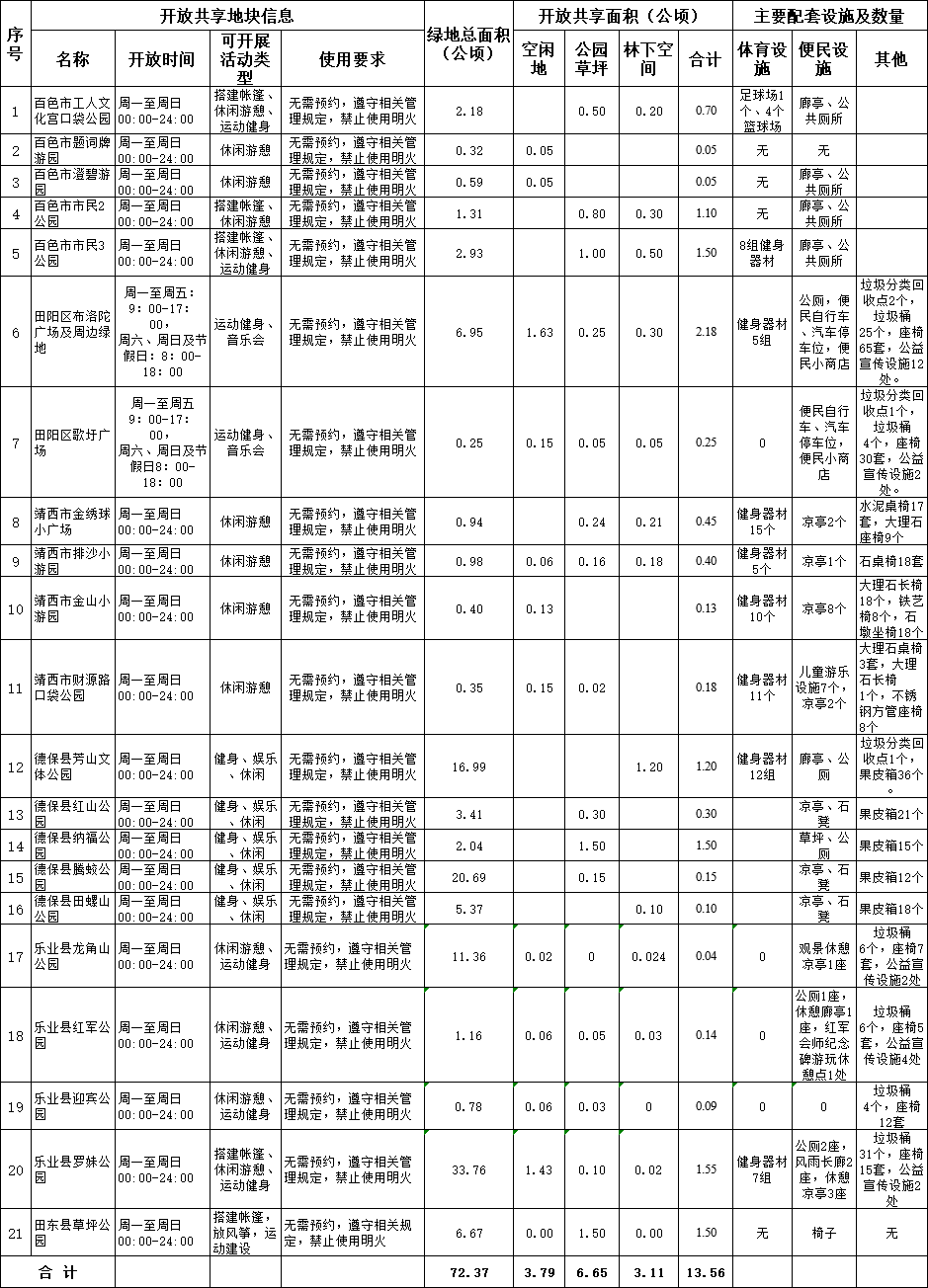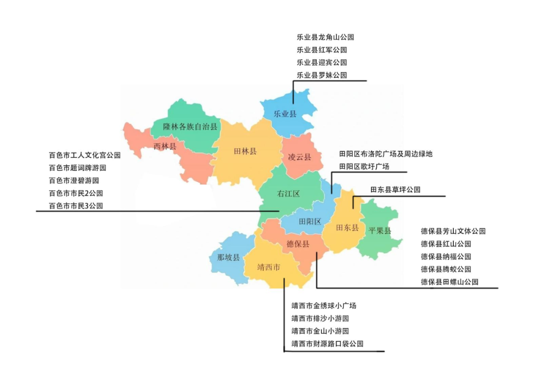 與以往相比,此次開放的共享綠地類型更為豐富。既有像百色市工人文化宮口袋公園這類配備免費籃球場的社區(qū)公園;也有如樂業(yè)縣龍角山公園、德�?h騰蛟公園等以自然山體為特色的山體公園;還有田陽區(qū)布洛陀廣場、靖西市金繡球小廣場等深度融合地方文化元素的特色廣場。多處綠地內(nèi)配有涼亭、座椅、公廁、健身器材等便民設施。