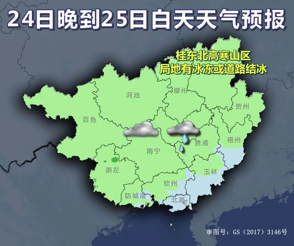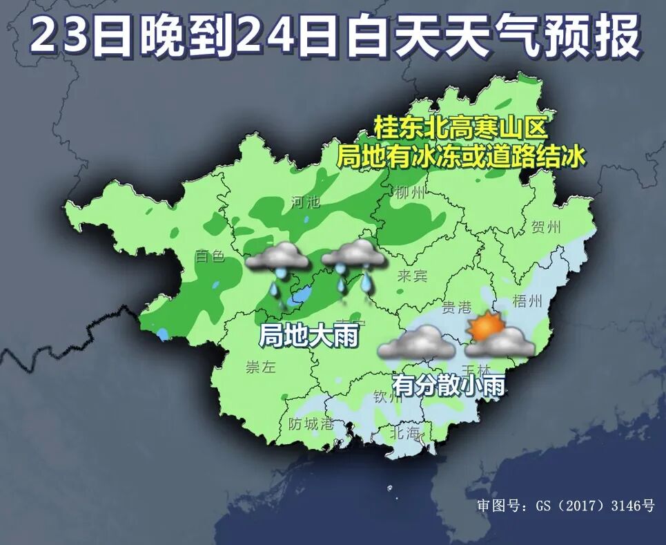 23日晚上到24日白天,桂北、桂西有小到中雨、局地大雨,其它地區(qū)陰天間多云有分散小雨,其中桂東北高寒山區(qū)局地有冰凍或道路結(jié)冰。