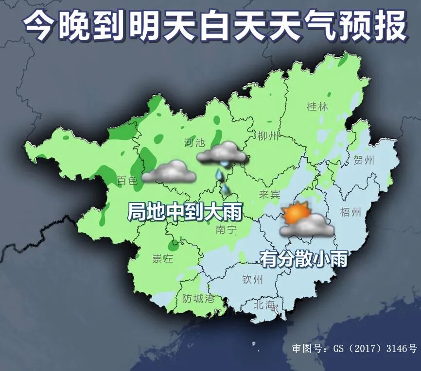 未來幾天廣西天氣迎來 “陰、雨、晴”三連變化 今晚到明天白天 新的冷空氣還在路上,南風(fēng)“掌權(quán)” 今晚桂北和桂南部分地方轉(zhuǎn)為陰雨天 雨量以小雨為主,局地可達(dá)中到大雨級別 桂西和沿海有霧 雨霧天氣道路濕滑 、能見度不佳 開車的小伙伴記得減速慢行~ 從23日晚開始冷空氣擴(kuò)散南下! 給我區(qū)自北向南帶來大風(fēng)!降雨!降溫! 預(yù)計(jì)23日晚到24日 冷暖空氣在廣西上空“拉拉扯扯” 桂北桂西將有小到中雨 局地大雨 其他地方云量增多 有分散小雨飄來 25日全區(qū)陰天大部有小雨 氣溫還會繼續(xù)下降 26日起冷空氣驅(qū)散陰云 廣西逐漸轉(zhuǎn)為晴天 大風(fēng) 受冷空氣影響 24日桂東北將最先刮起北風(fēng) 風(fēng)力:5~6級,陣風(fēng)可達(dá)7~8級偏北大風(fēng) 隨著冷空氣南下 25日大風(fēng)將影響桂東和沿海地區(qū)