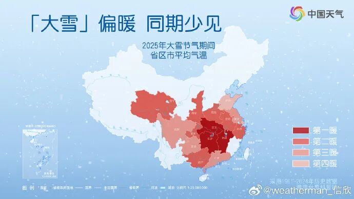 暖!暖!暖! 今年大雪節(jié)氣期間 從全國平均氣溫來看 廣西、青海、浙江等7個省(自治區(qū)) 平均氣溫排全國第二暖 湖南、江西、湖北更是 “暖成第一”
