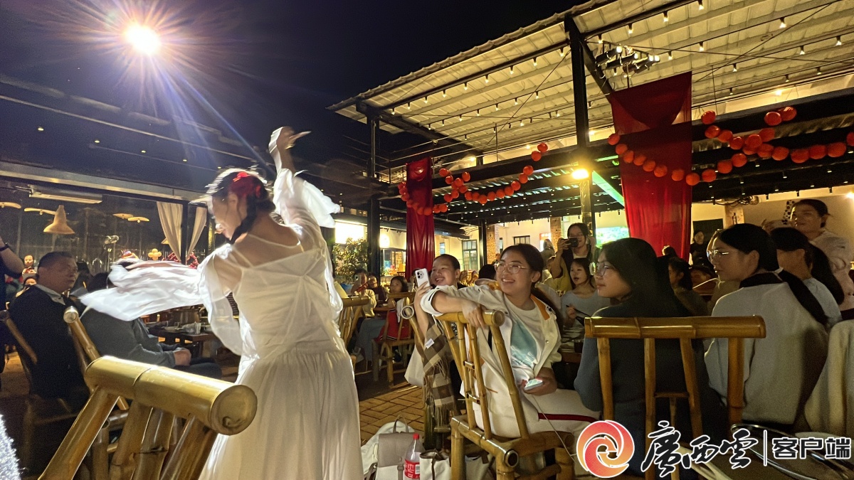 舞者在宴席之間穿梭,與游客互動。翻川新青年社區(qū)供圖 “餐秀融合了美食、音樂、舞蹈等多元文化元素,讓我們不僅吃得開心,更能收獲滿滿的情緒價值�!庇慰完扄愓f。餐秀正是這里火爆的“流量密碼”,許多游客來過之后,都會通過圖片和視頻向親友、網(wǎng)友熱情推介。