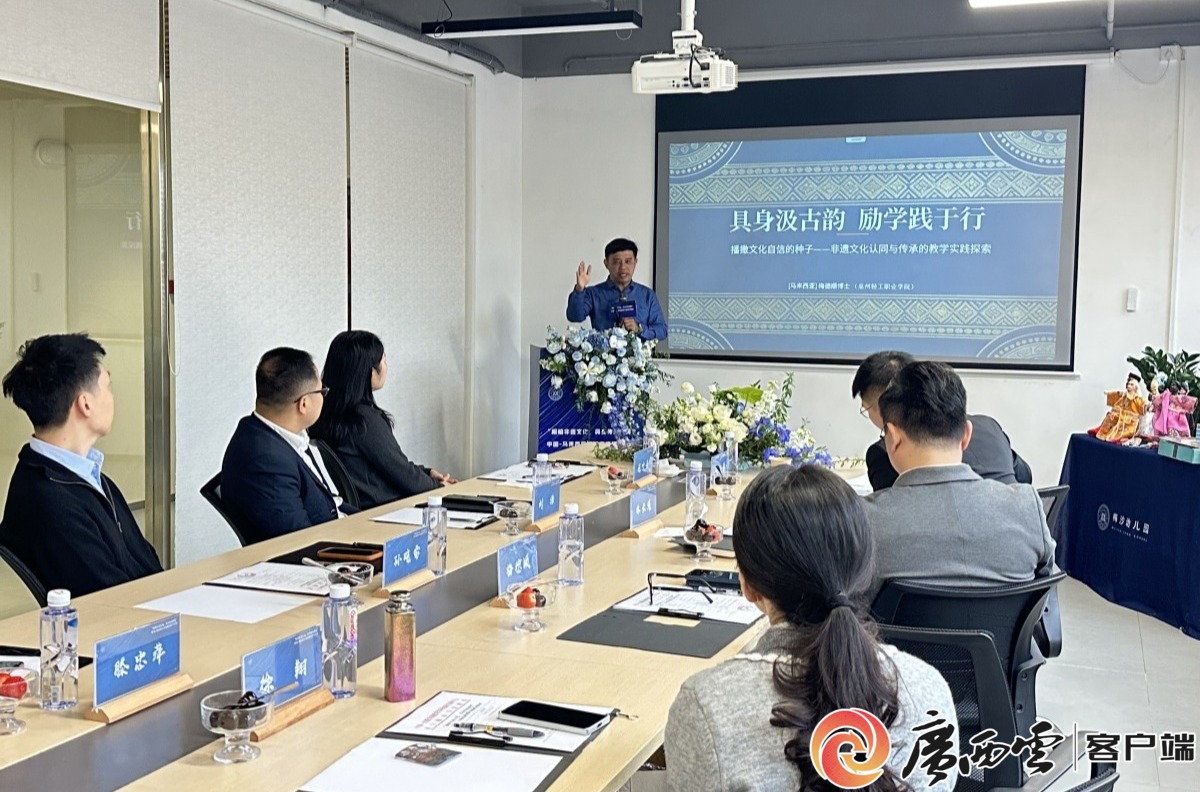 孫曉雷以《具身廣西非遺文化下的項(xiàng)目式課程介紹》為題分享實(shí)踐成果。徐佳毓 攝