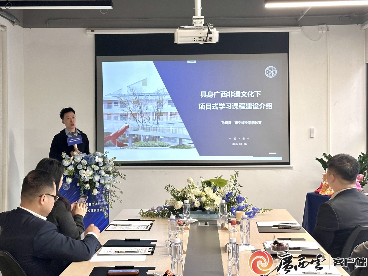 徐翔通過《漳韻版畫:藝術(shù)素養(yǎng)下的幼兒非遺項(xiàng)目式學(xué)習(xí)實(shí)踐》案例進(jìn)行分享。徐佳毓 攝 廣西幼兒師范高等�?茖W(xué)校滕忠萍教授在交流中指出:“將非遺融入學(xué)前教育,實(shí)質(zhì)是將文化血脈轉(zhuǎn)化為成長養(yǎng)分。今天的實(shí)踐真正做到了讓傳統(tǒng)‘可親、可玩、可傳承’。” 本次活動(dòng)亦是中馬學(xué)前教育務(wù)實(shí)合作的重要體現(xiàn)。此前,南寧梅沙幼兒園與馬來西亞檳城教育業(yè)者公會(huì)已于2025年12月建立友好合作關(guān)系�;谠摽蚣埽磥黼p方將在教學(xué)研討、師資交流、課程共建等方面開展實(shí)質(zhì)協(xié)作,共同探索傳統(tǒng)文化在幼兒教育中的融合路徑。