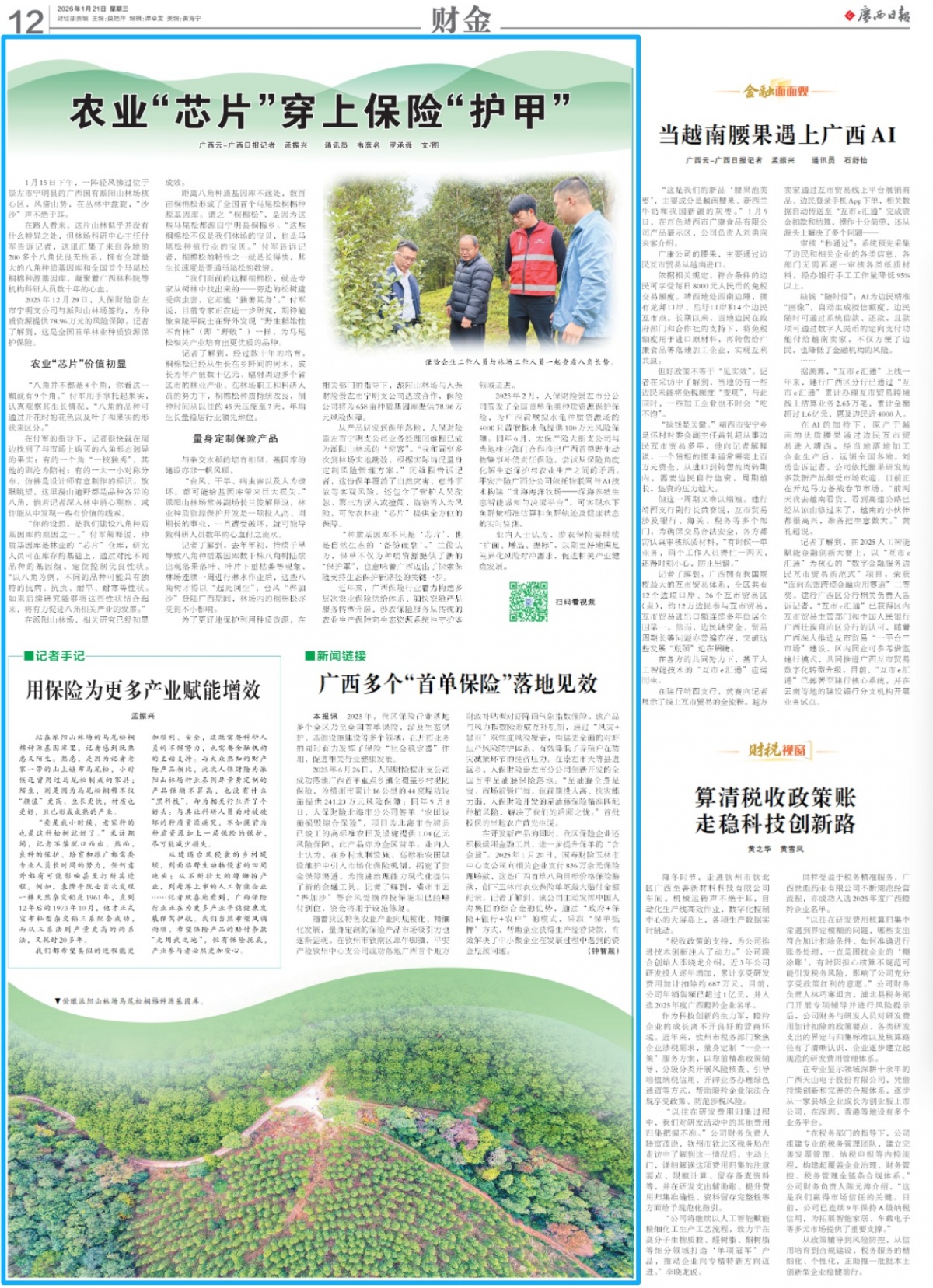 保險(xiǎn)企業(yè)工作人員與林場(chǎng)工作人員一起查看八角長(zhǎng)勢(shì)。廣西云-廣西日?qǐng)?bào)記者孟振興攝 從產(chǎn)品研發(fā)到保單落地,人保財(cái)險(xiǎn)崇左市寧明支公司業(yè)務(wù)經(jīng)理閉雄程已成為派陽(yáng)山林場(chǎng)的“�?汀�。“我和同事多次到林場(chǎng)實(shí)地勘驗(yàn),根據(jù)實(shí)際情況量身定制風(fēng)險(xiǎn)管理方案�!遍]雄程告訴記者,這份保單覆蓋了自然災(zāi)害、意外事故等客觀風(fēng)險(xiǎn),還包含了管護(hù)人員疏忽、第三方誤入或擅闖、盜竊等人為風(fēng)險(xiǎn),可為農(nóng)林業(yè)“芯片”提供全方位的保障。 “種質(zhì)基因庫(kù)不只是‘芯片’,也是自然生態(tài)的‘備份硬盤(pán)’�!碧m俊認(rèn)為,保單不僅為種質(zhì)資源提供了新的“保護(hù)罩”,也意味著廣西邁出了探索保險(xiǎn)支持生態(tài)保護(hù)新路徑的關(guān)鍵一步。 近年來(lái),廣西保險(xiǎn)行業(yè)著力構(gòu)建多層次農(nóng)業(yè)保險(xiǎn)供給體系、加快農(nóng)險(xiǎn)產(chǎn)品服務(wù)轉(zhuǎn)型升級(jí),涉農(nóng)保險(xiǎn)服務(wù)從傳統(tǒng)的農(nóng)業(yè)生產(chǎn)保障向生態(tài)資源系統(tǒng)性守護(hù)等領(lǐng)域邁進(jìn)。 2025年2月,人保財(cái)險(xiǎn)崇左市分公司簽發(fā)了全國(guó)首單龜類(lèi)種質(zhì)資源保護(hù)保險(xiǎn),為廣西黃喉擬水龜種質(zhì)資源場(chǎng)的4000只黃喉擬水龜提供100萬(wàn)元風(fēng)險(xiǎn)保障。同年6月,太保產(chǎn)險(xiǎn)大新支公司與當(dāng)?shù)亓謽I(yè)部門(mén)合作推出廣西首單野生動(dòng)物肇事補(bǔ)償責(zé)任保險(xiǎn),嘗試從保險(xiǎn)角度化解生態(tài)保護(hù)與農(nóng)業(yè)生產(chǎn)之間的矛盾。平安產(chǎn)險(xiǎn)廣西分公司依托物聯(lián)網(wǎng)與AI技術(shù)構(gòu)建“北海海洋牧場(chǎng)——深海養(yǎng)殖生態(tài)智能感知與決策平臺(tái)”,可實(shí)現(xiàn)水下魚(yú)群量精準(zhǔn)估算和魚(yú)群軌跡及健康狀態(tài)的實(shí)時(shí)監(jiān)測(cè)。 業(yè)內(nèi)人士認(rèn)為,涉農(nóng)保險(xiǎn)要繼續(xù)“擴(kuò)面、增品、提標(biāo)”,以期更好地滿(mǎn)足差異化風(fēng)險(xiǎn)對(duì)沖需求,促進(jìn)相關(guān)產(chǎn)業(yè)健康發(fā)展。 視頻攝制:孟振興 【新聞鏈接】廣西多個(gè)“首單保險(xiǎn)”落地見(jiàn)效 本報(bào)訊 2025年,我區(qū)保險(xiǎn)行業(yè)落地多個(gè)全區(qū)乃至全國(guó)首單保險(xiǎn),涉及生態(tài)保護(hù)、基礎(chǔ)設(shè)施建設(shè)等多個(gè)領(lǐng)域,在開(kāi)拓業(yè)務(wù)的同時(shí)有力發(fā)揮了保險(xiǎn)“社會(huì)穩(wěn)定器”作用,促進(jìn)相關(guān)行業(yè)健康發(fā)展。 2025年6月26日,人保財(cái)險(xiǎn)橫州支公司成功落地廣西首單重點(diǎn)鄉(xiāng)鎮(zhèn)全覆蓋鄉(xiāng)村堤防保險(xiǎn),為橫州市累計(jì)16公里的44座堤防設(shè)施提供241.23萬(wàn)元風(fēng)險(xiǎn)保障;同年9月8日,人保財(cái)險(xiǎn)北海市分公司簽單“農(nóng)田設(shè)施損毀綜合保險(xiǎn)”,項(xiàng)目為北海市合浦縣已竣工的高標(biāo)準(zhǔn)農(nóng)田及設(shè)施提供1.04億元風(fēng)險(xiǎn)保障,此產(chǎn)品亦為全區(qū)首單。業(yè)內(nèi)人士認(rèn)為,在鄉(xiāng)村水利設(shè)施、高標(biāo)準(zhǔn)農(nóng)田建設(shè)維護(hù)中引入市場(chǎng)化保險(xiǎn)機(jī)制,拓寬了資金保障渠道,為推進(jìn)治理能力現(xiàn)代化提供了新的金融工具。記者了解到,橫州市因“樺加沙”等臺(tái)風(fēng)受損的投保堤壩已經(jīng)賠付到位,資金將用于設(shè)施修復(fù)。