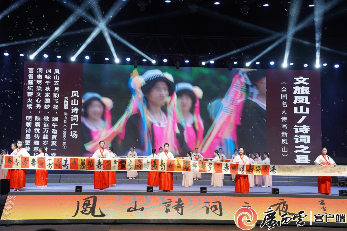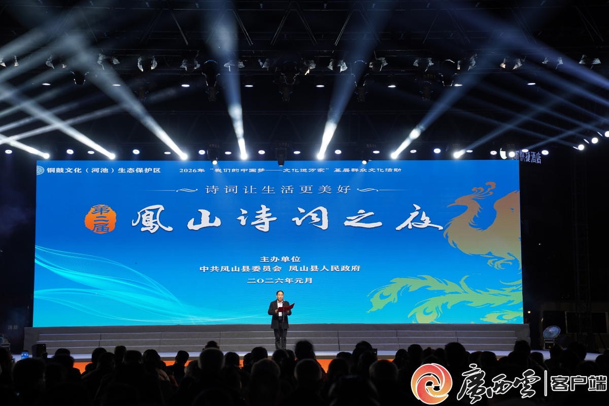 活動(dòng)現(xiàn)場(chǎng)。 1月25日晚,燈光映照下的鳳山縣詩(shī)詞廣場(chǎng)流光溢彩,人潮如織。2026年“我們的中國(guó)夢(mèng)——文化進(jìn)萬家”基層群眾文化活動(dòng)“詩(shī)詞讓生活更美好——第二屆鳳山詩(shī)詞之夜”在此拉開帷幕。這場(chǎng)以詩(shī)為媒的文化聚會(huì),是鳳山縣作為“中華詩(shī)詞之縣”創(chuàng)建成果的一次集中展示,也是當(dāng)?shù)貍鞒星晡拿}、以文化賦能高質(zhì)量發(fā)展的生動(dòng)實(shí)踐。 鳳山鐘靈毓秀,喀斯特地貌與紅韻文化、山歌傳統(tǒng)、生態(tài)底色相互交融,為詩(shī)詞創(chuàng)作提供了豐沃土壤。近年來,鳳山縣大力實(shí)施“文化興縣”戰(zhàn)略,扎實(shí)推進(jìn)詩(shī)詞“六進(jìn)”工程,已建成50個(gè)詩(shī)教示范單位,培育各級(jí)詩(shī)詞學(xué)會(huì)會(huì)員百余名,并于2023年成功獲評(píng)“中華詩(shī)詞之縣”。近期詩(shī)詞廣場(chǎng)的正式開放,加上“百村詩(shī)詞”活動(dòng)的蓬勃開展與詩(shī)詞館建設(shè)的穩(wěn)步推進(jìn),共同構(gòu)成了鳳山文化振興的堅(jiān)實(shí)平臺(tái)。