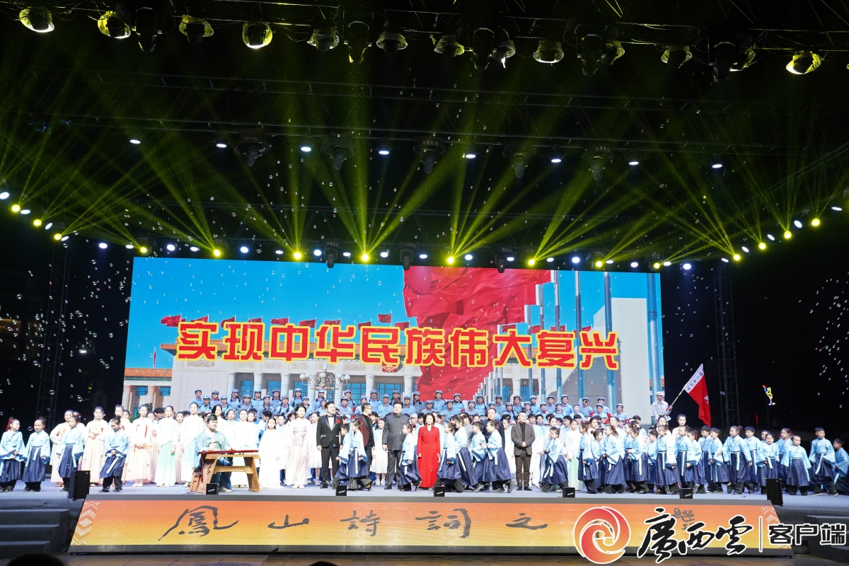 晚會(huì)現(xiàn)場(chǎng)。 晚會(huì)圍繞“人間最純是愛情”“人間最濃是鄉(xiāng)愁”“人間最真是友情”“人間大美是鳳山”“人間大愛是家國(guó)”五個(gè)篇章漸次展開�!对�(shī)經(jīng)》吟唱、《梁�!せ肺璧概c愛情詩(shī)詞誦讀彼此呼應(yīng),詮釋愛情本真;《鄉(xiāng)情·鄉(xiāng)愁·鄉(xiāng)學(xué)》朗誦、《憫農(nóng)》歌伴舞道出濃濃桑梓情懷;《將進(jìn)酒》獨(dú)誦、《友情·送別》三人朗誦盡顯摯友深誼;《人間大美是鳳山》將山水之秀與詩(shī)詞之雅融為一體;而《滿江紅》《七律·長(zhǎng)征》等經(jīng)典篇目,通過朗誦與歌舞的深情演繹,奏響了家國(guó)大愛的主旋律。整場(chǎng)演出形式多樣,吟唱、朗誦、歌舞相得益彰,展現(xiàn)出詩(shī)詞融入日常生活的蓬勃生命力。 未來,鳳山縣將以詩(shī)詞廣場(chǎng)啟用為新起點(diǎn),不斷厚植文化底蘊(yùn),持續(xù)擦亮“中華詩(shī)詞之縣”品牌,讓詩(shī)詞文化真正成為推動(dòng)縣域發(fā)展的精神底色,在新時(shí)代書寫文化繁榮與地方發(fā)展的嶄新篇章。
