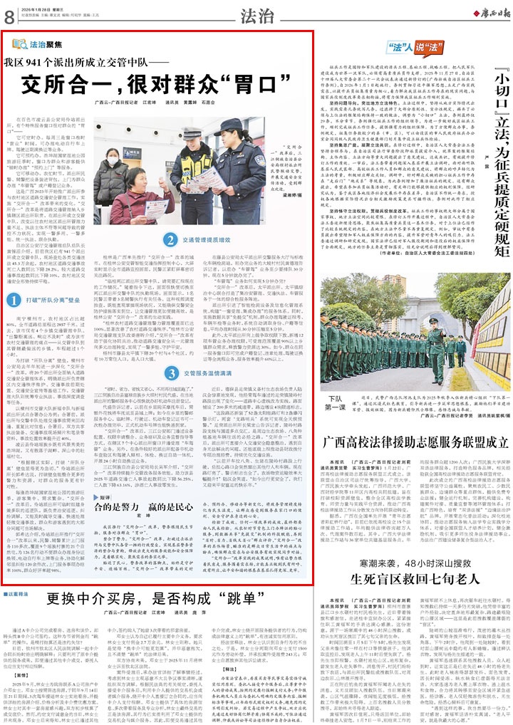 群眾到凌云縣公安局伶站派出所辦理“車管駕”業(yè)務(wù)。 每逢浩坤湖國(guó)家濕地公園的旅游旺季,游客集中、需求繁雜�!敖凰弦弧备母锖螅嬲九沙鏊膳R時(shí)組建身兼多職的巡邏隊(duì),既負(fù)責(zé)治安巡邏、糾紛調(diào)解,又能及時(shí)疏導(dǎo)交通、快速處理輕微交通事故,群眾和游客遇到的大部分問(wèn)題可當(dāng)場(chǎng)解決。 郭希達(dá)介紹,伶站派出所推行“交所合一”改革以來(lái),民警、輔警累計(jì)上門(mén)服務(wù)110多次,覆蓋9個(gè)瑤族村寨的21個(gè)自然屯,為126名行動(dòng)不便群眾辦理身份證換領(lǐng)、電動(dòng)自行車上牌等業(yè)務(wù),協(xié)助化解鄰里糾紛120余件次,上門(mén)服務(wù)事項(xiàng)辦結(jié)率100%,群眾好評(píng)率超98%。 2 交通管理提質(zhì)增效 桂林是廣西率先推行“交所合一”改革的城市。在桂林公安交管智能交通指揮控制中心,大屏實(shí)時(shí)顯示全市道路監(jiān)控畫(huà)面,民警正緊盯屏幕密切關(guān)注路況。 “臨桂兩江派出所交警中隊(duì),請(qǐng)簡(jiǎn)要匯報(bào)現(xiàn)在的工作情況�!彪S著指令下達(dá),畫(huà)面很快便切換至兩江派出所交警中隊(duì)的執(zhí)勤現(xiàn)場(chǎng)。畫(huà)面顯示,1名民警正帶著3名輔警執(zhí)行有關(guān)任務(wù)。這種視頻調(diào)度抽查,既能直觀掌握現(xiàn)場(chǎng)狀況,又能確保交警安全防護(hù)措施落實(shí)到位,讓交通管理更加便捷高效,是桂林公安“交所合一”改革的生動(dòng)實(shí)踐。 “桂林農(nóng)村道路交通管理警力管理覆蓋面已達(dá)100%,顯著改善了農(nóng)村道路交通秩序。”桂林市公安局交通管理支隊(duì)政委唐昕介紹,“交所合一”改革有助于強(qiáng)化協(xié)同共治,推動(dòng)道路交通安全從一元管理向多元治理轉(zhuǎn)變,實(shí)現(xiàn)了一警多能、守護(hù)平安。 梧州市藤縣太平鎮(zhèn)下轄20個(gè)村與6個(gè)社區(qū),約有10萬(wàn)常住人口,是人口大鎮(zhèn)。 在藤縣公安局太平派出所交警服務(wù)大廳與標(biāo)準(zhǔn)化車輛檢測(cè)站,剛辦完業(yè)務(wù)的大坡村村民黃德理告訴記者,以前辦“車管駕”業(yè)務(wù)至少要排隊(duì)30分鐘,現(xiàn)在5分鐘就辦完了。 “車管駕”業(yè)務(wù)如何實(shí)現(xiàn)5分鐘辦完? “交所合一”改革后,太平派出所、太平鎮(zhèn)綜治中心聯(lián)合打造了集治安管理、交通執(zhí)法、車管服務(wù)于一體的綜合性服務(wù)陣地。 派出所引進(jìn)了智能檢測(cè)設(shè)備及信息化管理系統(tǒng),構(gòu)建“一窗受理、集成辦理”的服務(wù)體系。同時(shí),實(shí)施數(shù)據(jù)共享“免提交”機(jī)制,群眾辦理駕駛證報(bào)考、車輛年檢等業(yè)務(wù)時(shí),系統(tǒng)自動(dòng)調(diào)取身份、戶籍等信息,平均辦理時(shí)間從30分鐘壓縮至5分鐘。 此外,太平派出所向上級(jí)爭(zhēng)取權(quán)限下放,新增12項(xiàng)車管業(yè)務(wù)辦理權(quán)限,可受理范圍覆蓋90%以上鄉(xiāng)鎮(zhèn)群眾需求,釋放警力資源達(dá)30%。如今,群眾在同一服務(wù)窗口即可完成戶籍登記、違章處理、駕駛證換證等全流程業(yè)務(wù),服務(wù)效率提升60%以上。 3 交管服務(wù)溫情滿滿 “省時(shí)、省力、省錢(qián)又省心,不用再往城里跑了�!比弊遄灾慰h富祿苗族鄉(xiāng)大順村村民代盛,在當(dāng)?shù)嘏沙鏊木]服務(wù)中心很快就辦好機(jī)動(dòng)車注冊(cè)登記。 代盛告訴記者,以前在鄉(xiāng)里購(gòu)買(mǎi)摩托車后,需額外花錢(qián)將車托運(yùn)至縣城上牌;如今在鄉(xiāng)里的警郵服務(wù)中心,臨時(shí)牌、行駛證、機(jī)動(dòng)車登記證書(shū)可一次性辦理完畢,正式機(jī)動(dòng)車號(hào)牌也能快遞到家。 “交所合一”改革后,三江公安部門(mén)通過(guò)設(shè)備配置、權(quán)限申請(qǐng)整合、業(yè)務(wù)培訓(xùn)及業(yè)務(wù)監(jiān)督指導(dǎo)等方式,在轄區(qū)7個(gè)中心派出所窗口開(kāi)通受理“車駕管”業(yè)務(wù)。另外,在條件較好的派出所配備非機(jī)動(dòng)車查驗(yàn)區(qū)和駕駛?cè)苏障�、體檢、換證自助一體機(jī),開(kāi)展24小時(shí)自助換證業(yè)務(wù)。 三江侗族自治縣公安局局長(zhǎng)吳軍介紹,“交所合一”改革持續(xù)提升交管政務(wù)服務(wù)效能,助力該縣2025年道路交通亡人事故起數(shù)同比下降56.25%,亡人數(shù)下降63.16%,涉酒亡人事故零發(fā)生。 近日,德�?h足榮鎮(zhèn)義備村生態(tài)農(nóng)場(chǎng)負(fù)責(zé)人陸漢會(huì)驚喜地發(fā)現(xiàn),他經(jīng)常駕車通過(guò)的足榮鎮(zhèn)陵嶺村路段出現(xiàn)了變化——道路中心虛線改為實(shí)線,路面鋪設(shè)了200多米的減速帶,路邊增設(shè)4塊限速標(biāo)志。 “這段路還新裝了52盞太陽(yáng)能路燈和2盞爆閃警示燈,兩套‘支路哨兵’系統(tǒng)可實(shí)現(xiàn)全天候預(yù)警�!弊銟s派出所所長(zhǎng)潘國(guó)俊告訴記者,陵嶺村路段支線與國(guó)道多點(diǎn)交匯,是周邊生態(tài)農(nóng)場(chǎng)、八角種植基地車輛往返的必經(jīng)之路。“交所合一”改革后,派出所可直接介入交通安全隱患整治,遇到自身無(wú)法解決的問(wèn)題,還能逐級(jí)上報(bào)推動(dòng)縣財(cái)政撥付專項(xiàng)治理經(jīng)費(fèi),持續(xù)優(yōu)化交通設(shè)施。 “以前開(kāi)車?y