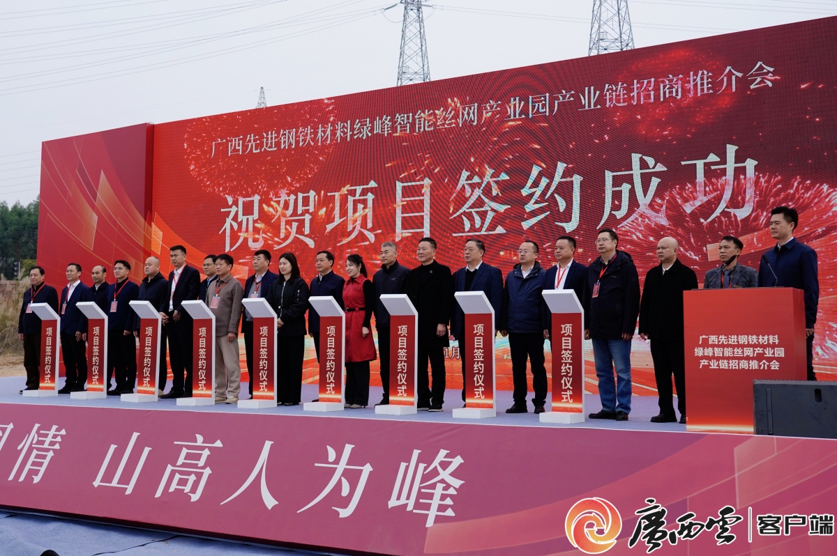 活動現(xiàn)場視頻。攝制:實習(xí)生 謝奇良 1月29日,賀州市招商引資捷報頻傳,三場重大項目簽約活動同日舉行,成果豐碩,為產(chǎn)業(yè)升級注入強(qiáng)勁動能。 鋼鐵產(chǎn)業(yè)升級再添新引擎 在廣西先進(jìn)鋼鐵材料綠峰智能絲網(wǎng)產(chǎn)業(yè)園產(chǎn)業(yè)鏈招商推介會上,24個項目成功簽約,總投資額達(dá)25.6億元。該推介會吸引了40多家企業(yè)、110多位企業(yè)家參與。據(jù)了解,綠峰智能絲網(wǎng)產(chǎn)業(yè)園由綠峰智能(廣西)新材料有限公司投資建設(shè),該公司是八步區(qū)國有企業(yè)與民營資本合資成立的企業(yè)。項目選址賀州市八步區(qū)信都鎮(zhèn),總規(guī)劃面積約1370畝,設(shè)計總產(chǎn)能200萬噸,總投資約50億元人民幣。 其中,一期工程占地536畝,位于桂鑫鋼鐵廠東南側(cè),投資約30億元。該項目充分利用八步區(qū)獨(dú)特的區(qū)位優(yōu)勢和短流程煉鋼產(chǎn)業(yè)基礎(chǔ),結(jié)合綠峰智能公司在專業(yè)人才、管理技術(shù)、市場運(yùn)營等方面的優(yōu)勢,實現(xiàn)優(yōu)勢互補(bǔ),共同推動八步區(qū)鋼鐵產(chǎn)業(yè)轉(zhuǎn)型升級。