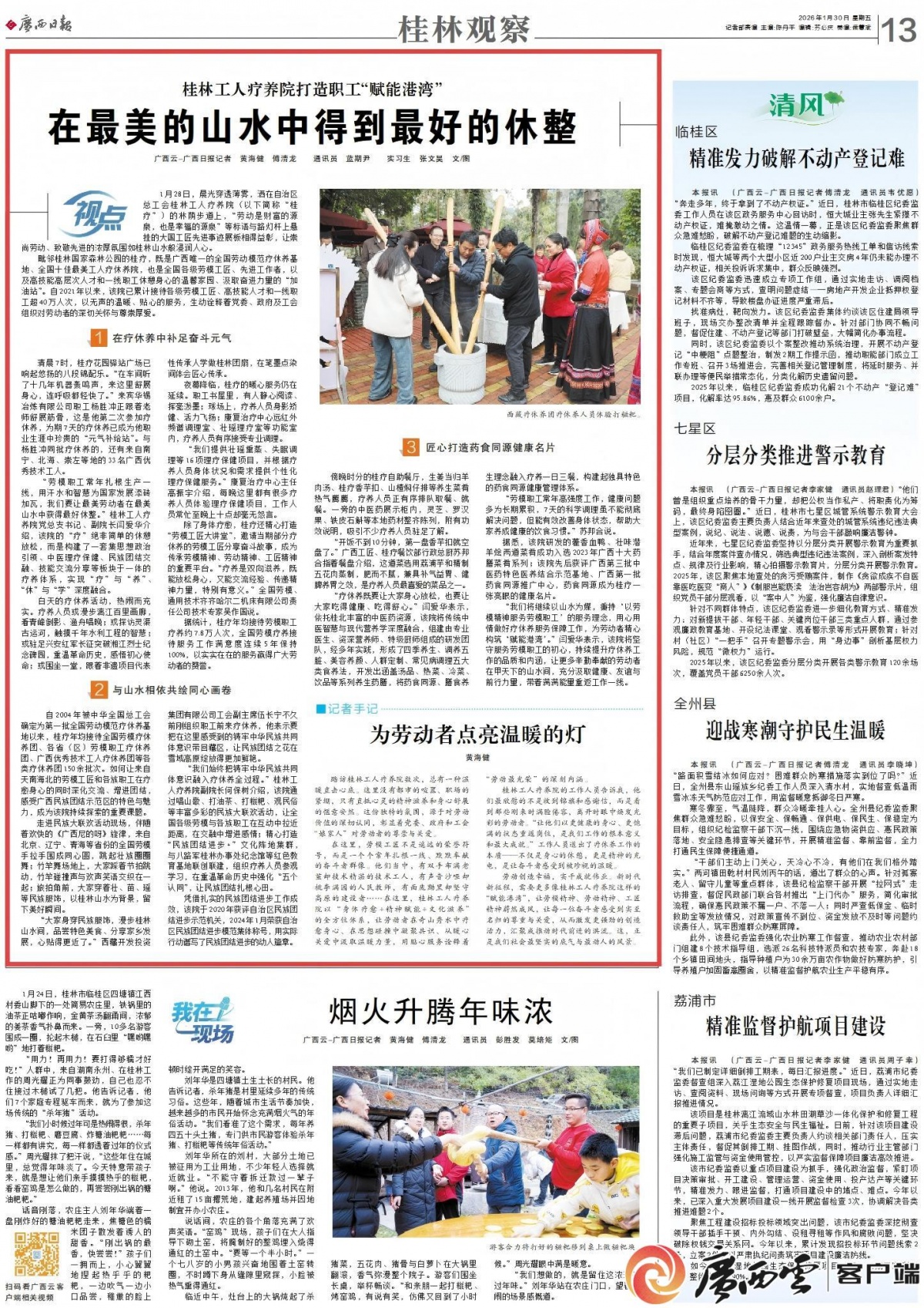廣西日報報道。 1月28日,晨光穿透薄霧,灑在自治區(qū)總工會桂林工人療養(yǎng)院(以下簡稱“桂療”)的林蔭步道上,“勞動是財富的源泉,也是幸福的源泉”等標(biāo)語與路燈桿上懸掛的大國工匠先進(jìn)事跡展板相得益彰,讓崇尚勞動、致敬先進(jìn)的濃厚氛圍如桂林山水般浸潤人心。 毗鄰桂林國家森林公園的桂療,既是廣西唯一的全國勞動模范療休養(yǎng)基地、全國十佳最美工人療休養(yǎng)院,也是全國各級勞模工匠、先進(jìn)工作者,以及高技能高層次人才和一線職工休憩身心的溫馨家園、汲取奮進(jìn)力量的“加油站”。自2021年以來,該院已累計接待各級勞模工匠、高技能人才和一線職工超40萬人次,以無聲的溫暖、貼心的服務(wù),生動詮釋著黨委、政府及工會組織對勞動者的深切關(guān)懷與尊崇厚愛。 在療休養(yǎng)中補足奮斗元氣 清晨7時,桂療花園驛站廣場已響起悠揚的八段錦配樂。“在車間聽了十幾年機器轟鳴聲,來這里舒展身心,連呼吸都輕快了。”來賓華錫冶煉有限公司職工楊勝沖正跟著老師舒展筋骨,這是他第二次參加療休養(yǎng),為期7天的療休養(yǎng)已成為他職業(yè)生涯中珍貴的“元氣補給站”與楊勝沖同批療休養(yǎng)的,還有來自南寧、北海、崇左等地的33名廣西優(yōu)秀技術(shù)工人。 “勞模職工常年扎根生產(chǎn)一線,用汗水和智慧為國家發(fā)展添磚加瓦,我們要讓最美勞動者在最美山水中獲得最好休整�!惫鹆止と睡燄B(yǎng)院黨總支書記、副院長閆愛華介紹,該院的“療”絕非簡單的休憩放松,而是構(gòu)建了一套集思想政治引領(lǐng)、中醫(yī)理療保健、民族團結(jié)交融、技能交流分享等板塊于一體的療養(yǎng)體系,實現(xiàn)“療”與“養(yǎng)”、“休”與“學(xué)”深度融合。