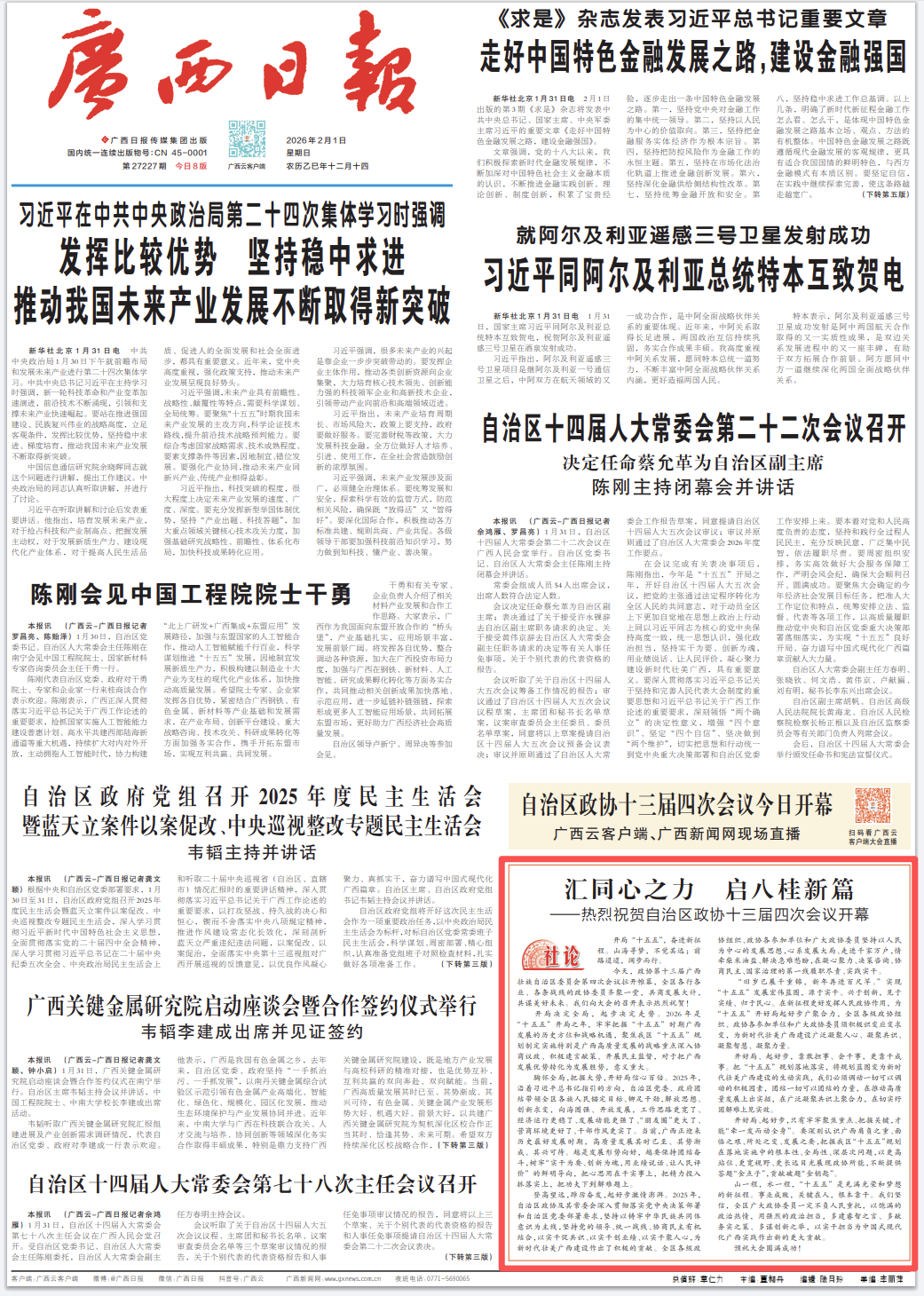 廣西日報社論丨匯同心之力 啟八桂新篇——熱烈祝賀自治區(qū)政協(xié)十三屆四次會議開幕 |