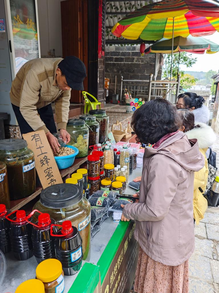 揚(yáng)美村三角市依舊保留古色古香的風(fēng)貌。南寧市江南區(qū)委宣傳部供圖 在貫穿揚(yáng)美村南北的解放街中部的三角市上,脫貧戶杜襲年和妻子冼碧娥經(jīng)營的土特產(chǎn)店正在開門迎客。門前整齊擺放著“揚(yáng)美三寶”——豆豉、梅菜、沙糕,以及山黃皮干、檸檬醬等產(chǎn)品,有幾名游客正在選購豆豉和花生。 文旅產(chǎn)業(yè)帶活了特色農(nóng)產(chǎn)品銷售,助力杜襲年一家脫貧增收。杜襲年說:“靠著這個(gè)小店,一年賣土特產(chǎn)能收入六七萬元�!� 杜襲年夫婦有兩個(gè)孩子,大女兒已出嫁,小女兒還在上大學(xué)。2024年10月至2025年9月,他家享受“雨露計(jì)劃”補(bǔ)助2400元。杜襲年說:“現(xiàn)在生活不愁,希望新的一年來揚(yáng)美的游客更多一點(diǎn)。”