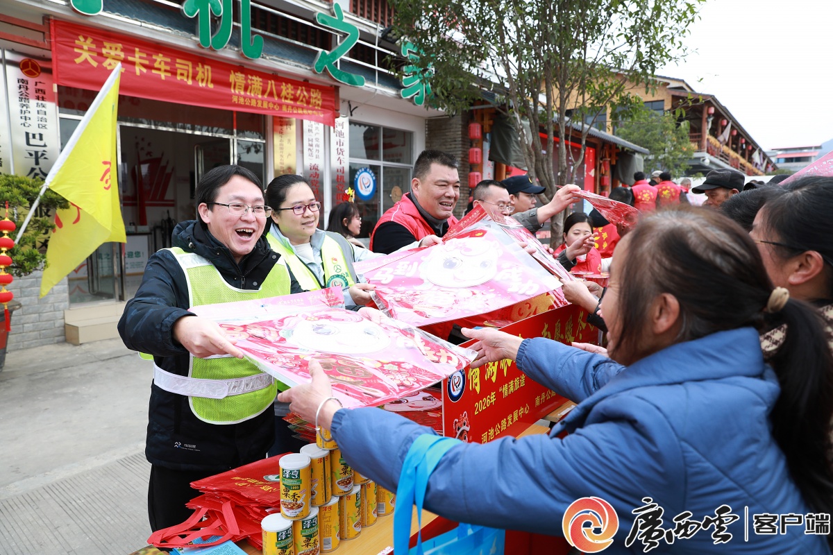 河池公路發(fā)展中心到國道210線南丹巴平公路服務(wù)區(qū)開展春運志愿服務(wù)活動。 2月2日,為期40天的2026年春運拉開大幕。當天,河池公路發(fā)展中心與南丹公路養(yǎng)護中心、南丹縣總工會到國道210線南丹縣巴平公路服務(wù)區(qū),開展“關(guān)愛卡車司機 情滿八桂公路”“情滿旅途”春運志愿服務(wù)活動,以公路人的真心真情溫馨服務(wù)幫助廣大司乘人員和返鄉(xiāng)群眾,讓春運回家之路更平安、更溫暖。 巴平公路服務(wù)區(qū)距離黔桂交界約15公里,是云、貴、川、渝等省市進入廣西的第一個形象窗口,進入服務(wù)區(qū)停車休整的車輛以及司乘人員較多。