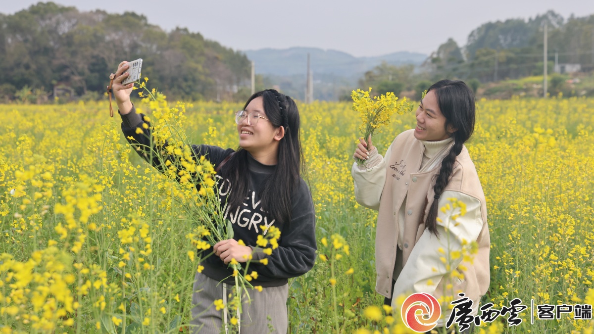 長(zhǎng)勢(shì)良好的油菜花。 2月3日,象州縣象州鎮(zhèn)龍富村的油菜花迎來盛花期,連片金黃花田與壯族村落交相輝映,勾勒出一幅生機(jī)盎然的春日田園畫卷,目之所及皆是詩(shī)意與生機(jī)。不少游客踏春而來,或穿行花間沉浸式賞景,或駐足取景拍照定格春光,在清新田園風(fēng)光中擁抱春日氣息。 “聽朋友說龍富的油菜花開了,我們今天從象州趕過來這里拍照,來到這里一看,果然黃黃的一片油菜花,非常美,心情太好了!”游客曹玉秋舉著手機(jī)不停拍照,臉上滿是笑意。 游客在花叢中拍照。 不遠(yuǎn)處,覃雅妃正和同伴在花徑漫步,快門聲不斷:“這片油菜花金燦燦的,真好看!今天拍了超級(jí)多的照片,超出片!”