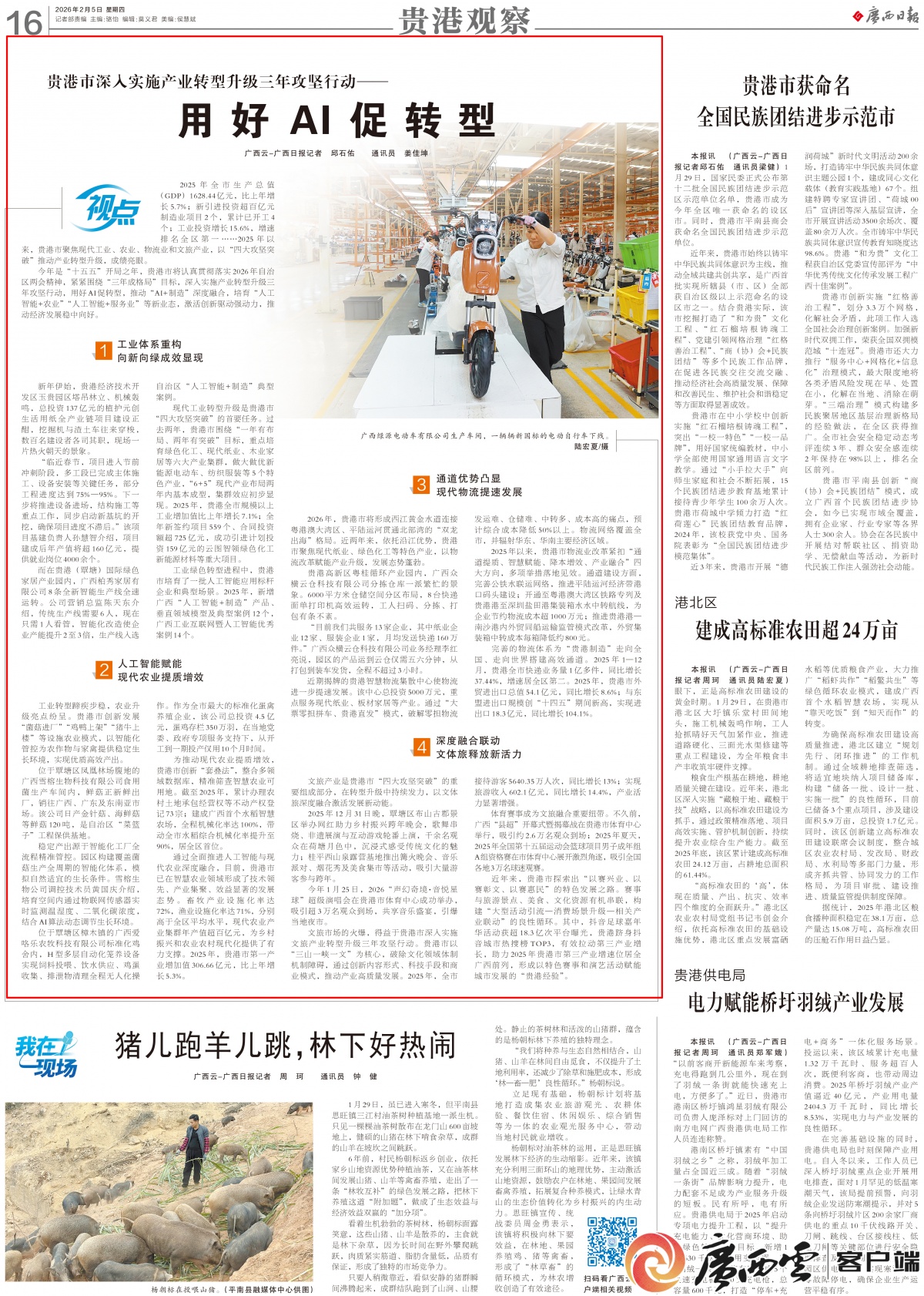 廣西日?qǐng)?bào)版面截圖。 2025年全市生產(chǎn)總值(GDP)1628.44億元,比上年增長(zhǎng)5.7%;新引進(jìn)投資超百億元制造業(yè)項(xiàng)目2個(gè),累計(jì)已開工4個(gè);工業(yè)投資增長(zhǎng)15.6%,增速排名全區(qū)第一……2025年以來,貴港市聚焦現(xiàn)代工業(yè)、農(nóng)業(yè)、物流業(yè)和文旅產(chǎn)業(yè),以“四大攻堅(jiān)突破”推動(dòng)產(chǎn)業(yè)轉(zhuǎn)型升級(jí),成績(jī)亮眼。
