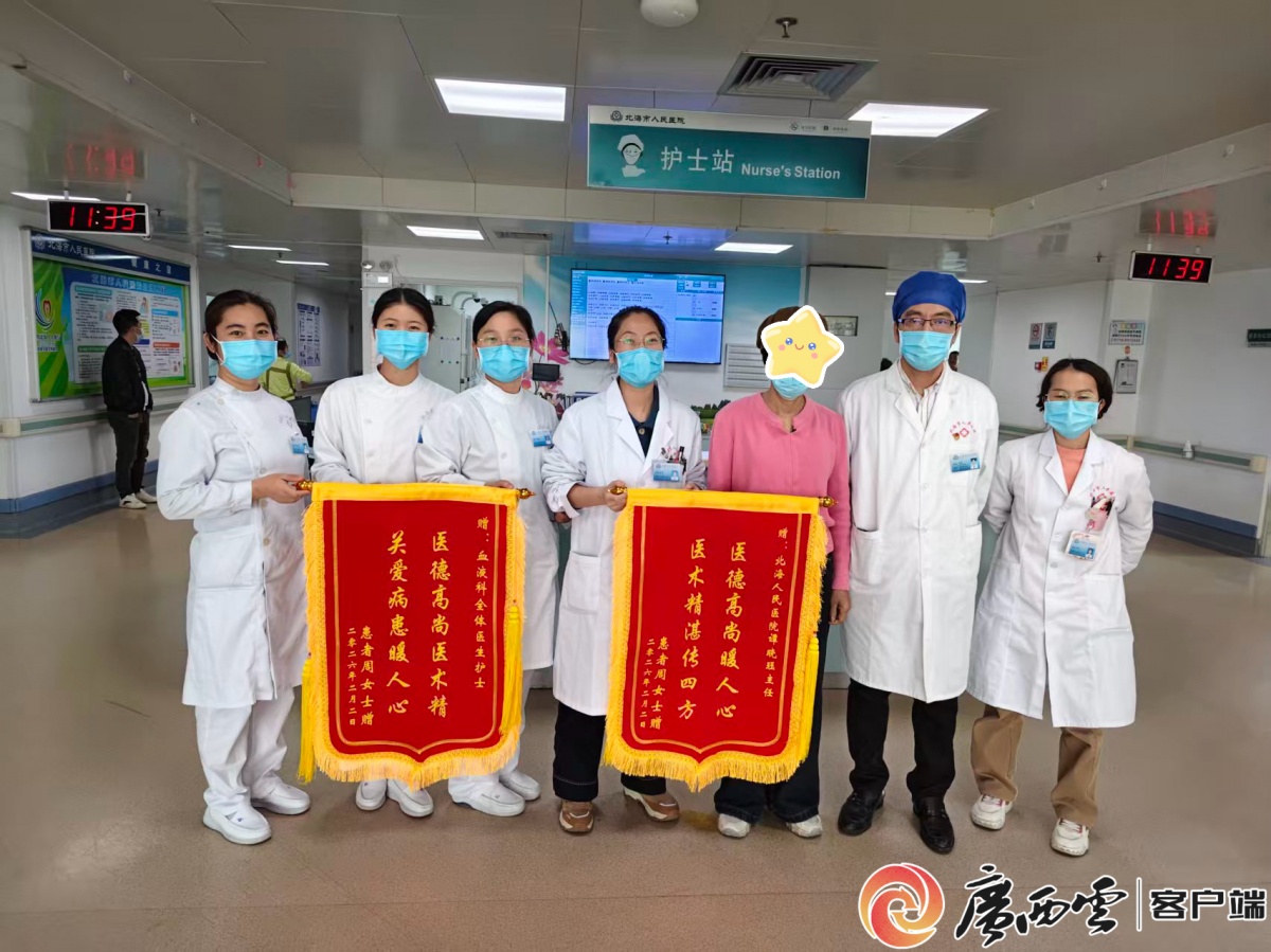 錦旗飄飄寄真情,醫(yī)患同心暖寒冬。 “謝謝唐醫(yī)生,有你在,我非常放心!”也許是醫(yī)患同心的雙向奔赴,預(yù)處理、干細(xì)胞回輸、造血重建等環(huán)節(jié)均順利完成。當(dāng)天,經(jīng)評(píng)估,周阿姨各項(xiàng)指標(biāo)達(dá)到出倉(cāng)標(biāo)準(zhǔn),可以直接出院。 一面錦旗,不僅是一份信任,更是一片真情。 “從決定移植到走完移植全程,我們作為陪伴者,全程感受到了患者經(jīng)濟(jì)困頓、心理憂懼、孤獨(dú)抗癌的各種心理變化。醫(yī)療救治是醫(yī)患雙向奔赴目標(biāo)的過(guò)程,感恩我們彼此守護(hù),順利到達(dá)終點(diǎn)�!苯舆^(guò)沉甸甸的錦旗,唐曉鈺倍感欣慰。 “北海市造血干細(xì)胞移植實(shí)現(xiàn)零的突破,將惠及北海和周邊地區(qū),為患者帶來(lái)在家門口即可享就醫(yī)的新希望�!辈稍L中,當(dāng)?shù)厝罕娂娂婞c(diǎn)贊。 |