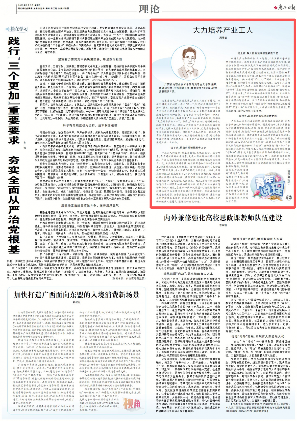 周陸敏:廣西機(jī)電職業(yè)技術(shù)學(xué)院馬克思主義學(xué)院講師、助理研究員,主持課題5項(xiàng),發(fā)表論文10余篇,教學(xué)競賽獲獎7項(xiàng)。 技術(shù)再迭代、產(chǎn)業(yè)再發(fā)展,產(chǎn)業(yè)工人也不可替代。從新中國建立之初的一個個“第一”,到突破關(guān)鍵領(lǐng)域的“卡脖子”技術(shù),再到托舉起“大國重器”的中堅力量——中國產(chǎn)業(yè)工人無疑是建設(shè)中國特色社會主義現(xiàn)代化強(qiáng)國大廈最堅實(shí)的添磚加瓦者。習(xí)近平總書記參加黨的二十大廣西代表團(tuán)討論時,高度肯定產(chǎn)業(yè)工人的重要作用,強(qiáng)調(diào)要“大力培養(yǎng)產(chǎn)業(yè)工人”。當(dāng)前,廣西正全力打造制造業(yè)十大現(xiàn)代化支柱產(chǎn)業(yè)。破解人才供給與產(chǎn)業(yè)升級之間的結(jié)構(gòu)性矛盾,建設(shè)一支高素質(zhì)產(chǎn)業(yè)工人隊伍,已成為關(guān)乎全局、事關(guān)長遠(yuǎn)的緊迫課題。但培養(yǎng)產(chǎn)業(yè)工人絕非一日之功,唯有沉下來錘煉匠者之心、迎上前鍛造新質(zhì)工匠、跨過去拓寬成才之路,方能培養(yǎng)出一支支撐廣西制造邁向高質(zhì)量發(fā)展的產(chǎn)業(yè)工人隊伍。