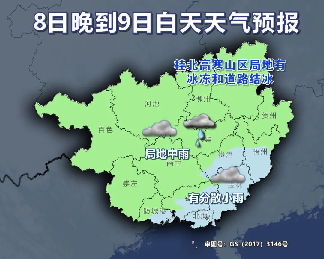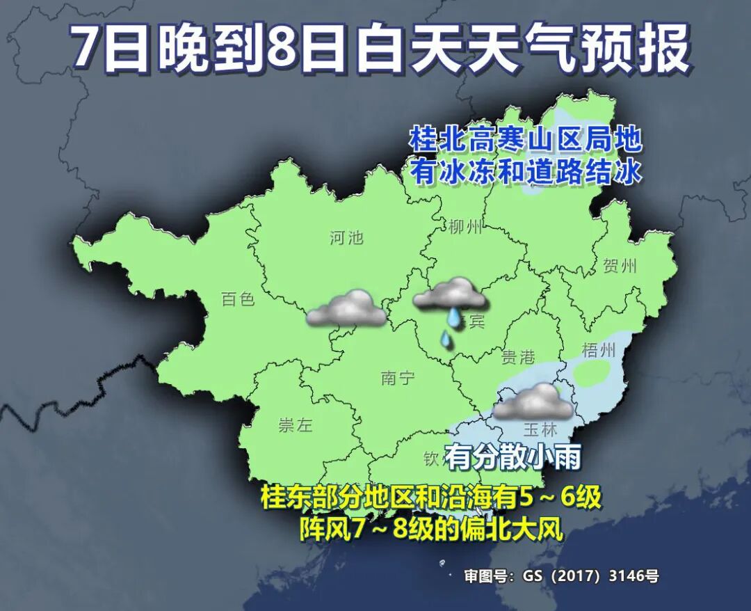 7日晚上到8日白天,桂北、桂西陰天有小雨,其它地區(qū)陰天有分散小雨。桂北高寒山區(qū)局地有冰凍和道路結(jié)冰。最低氣溫:高寒山區(qū)-3~3℃,桂東北4~8℃,其它地區(qū)8~12℃。