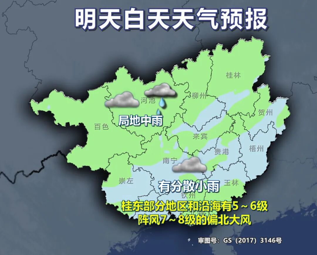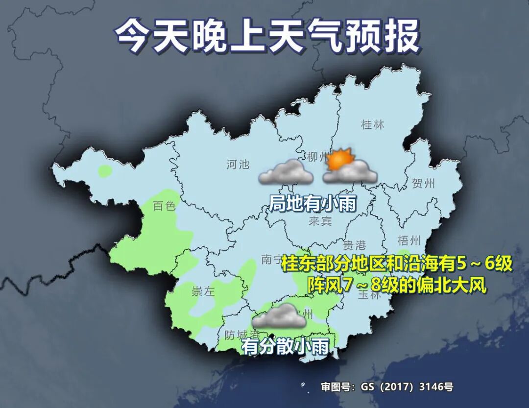 今天晚上,百色、崇左、南寧、防城港、欽州、北海等市陰天有分散小雨,其它地區(qū)陰天間多云、局地有小雨。